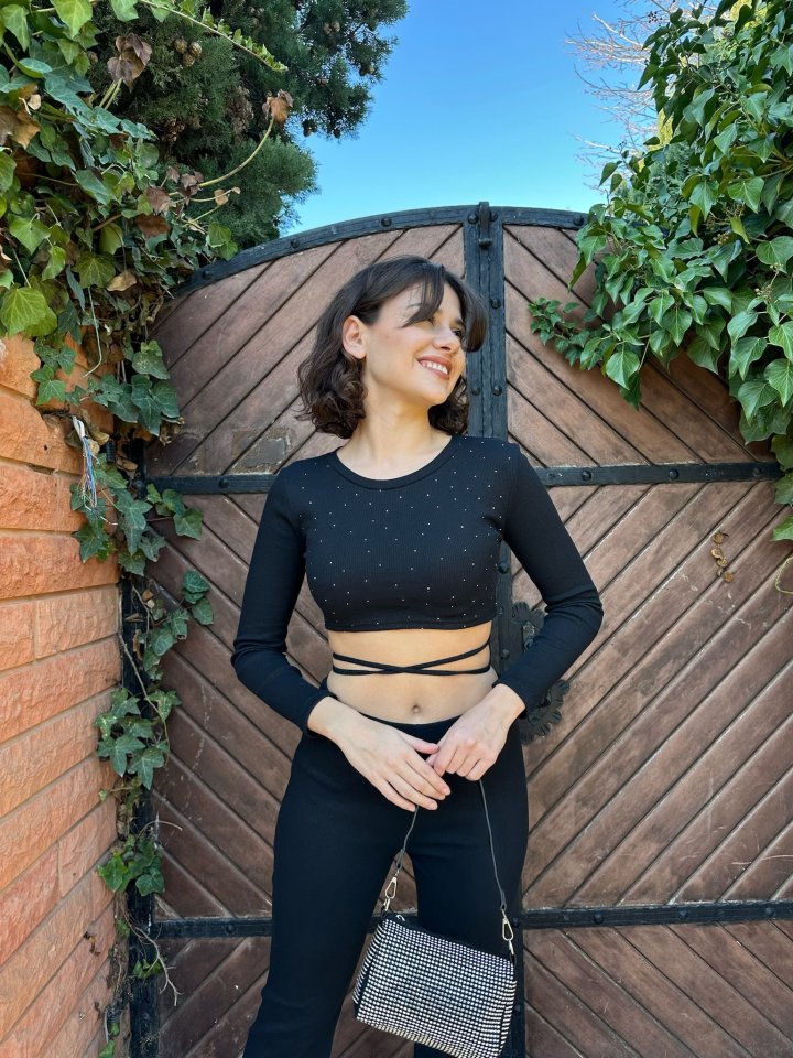 Kadın Paçası Yırtmaç Detaylı Taşlı Bel Bağlamalı Kaşkorse İkili Takım