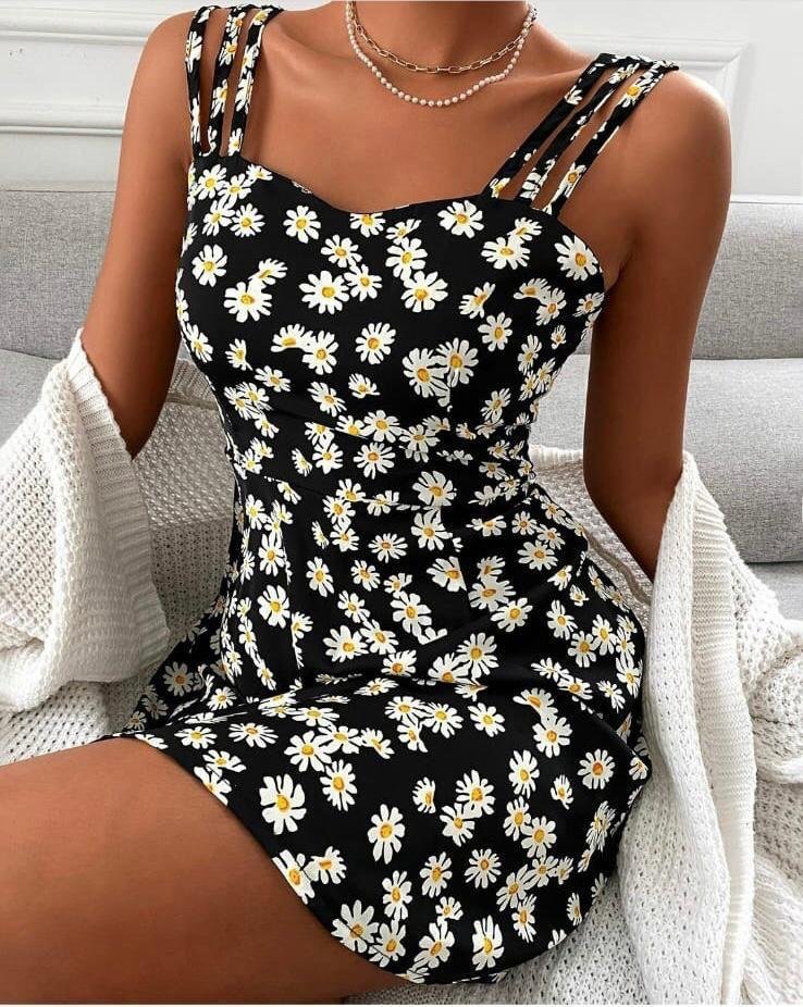 Kadın Papatya Desen Mikro Kumaş Askılı Elbise
