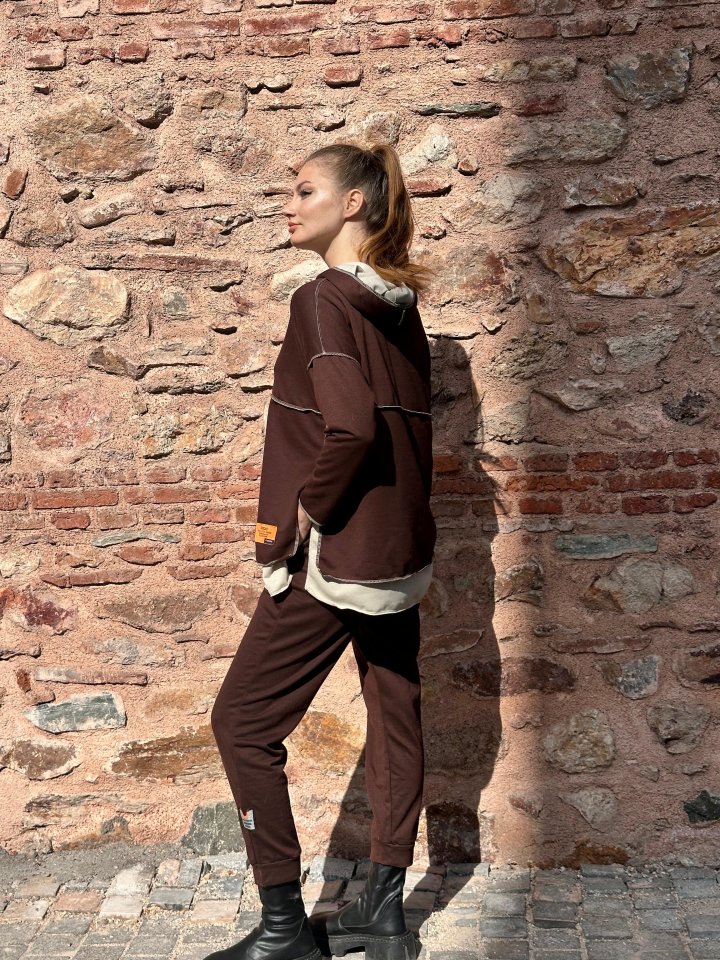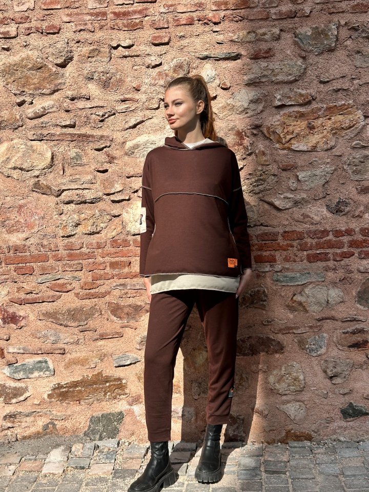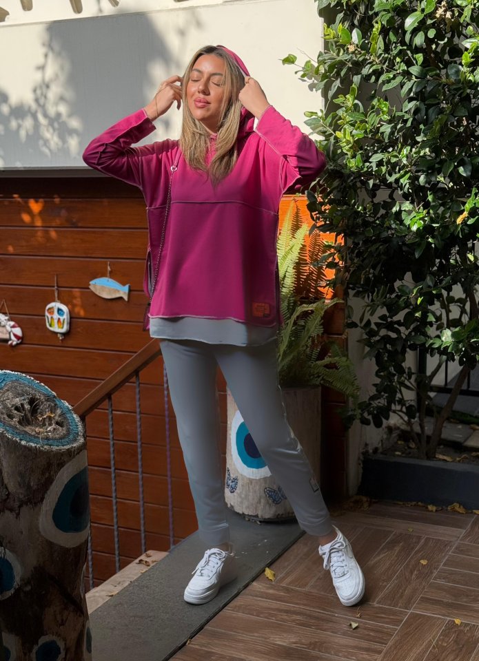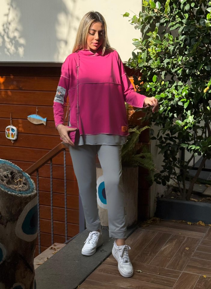 Kadın Pembe Kapşonlu Etek Ucu Detay Arma Ters Dikiş Gorunumlu Ikili Takım