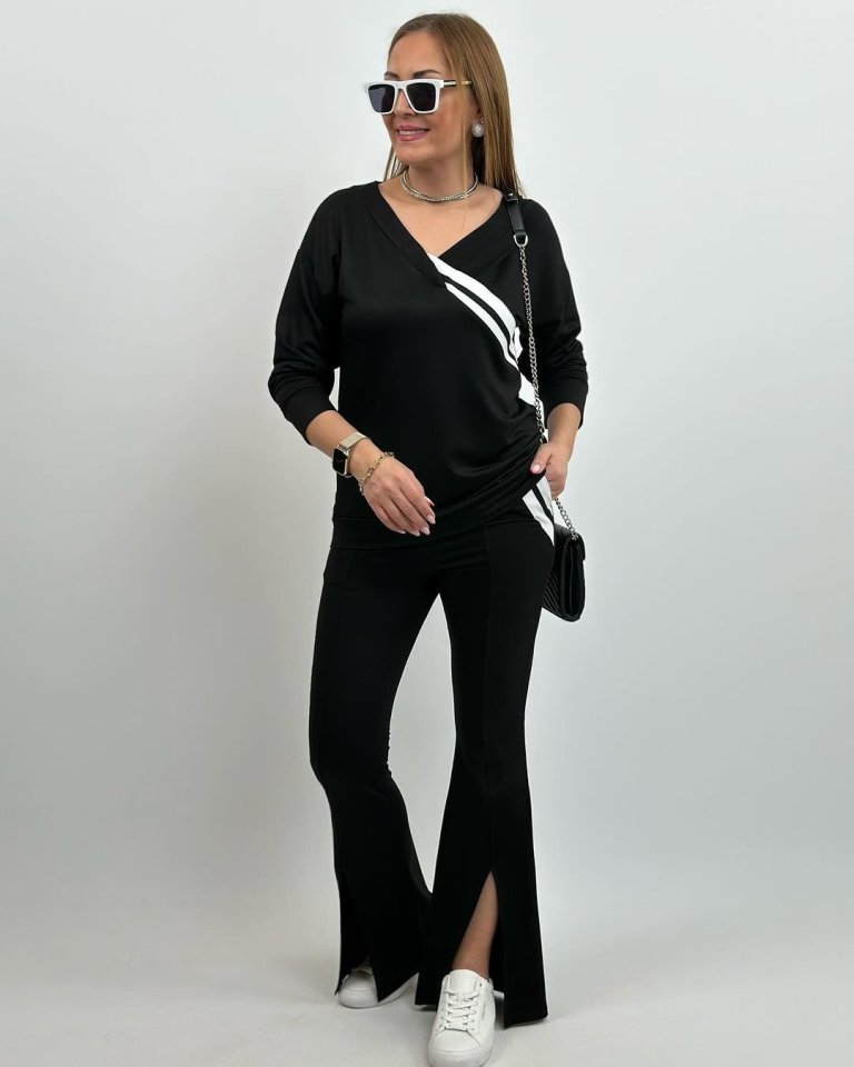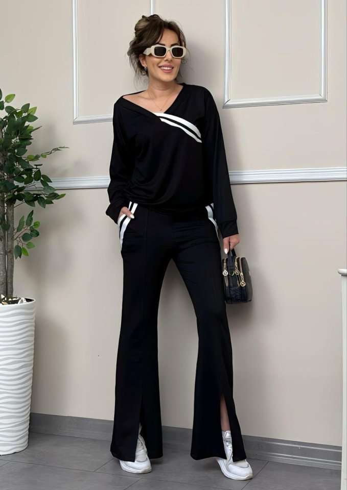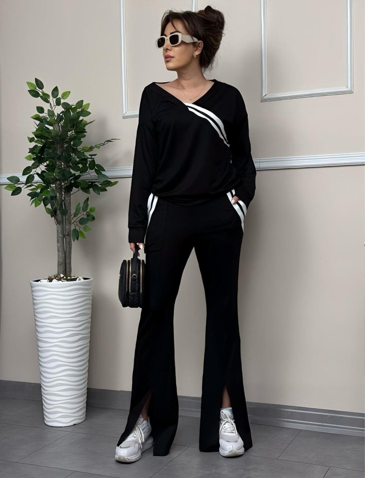 Kadın Ribana Detay Bluz Ve Ispanyol Paça Yırtmaçlı Pantolon Ikili Takım