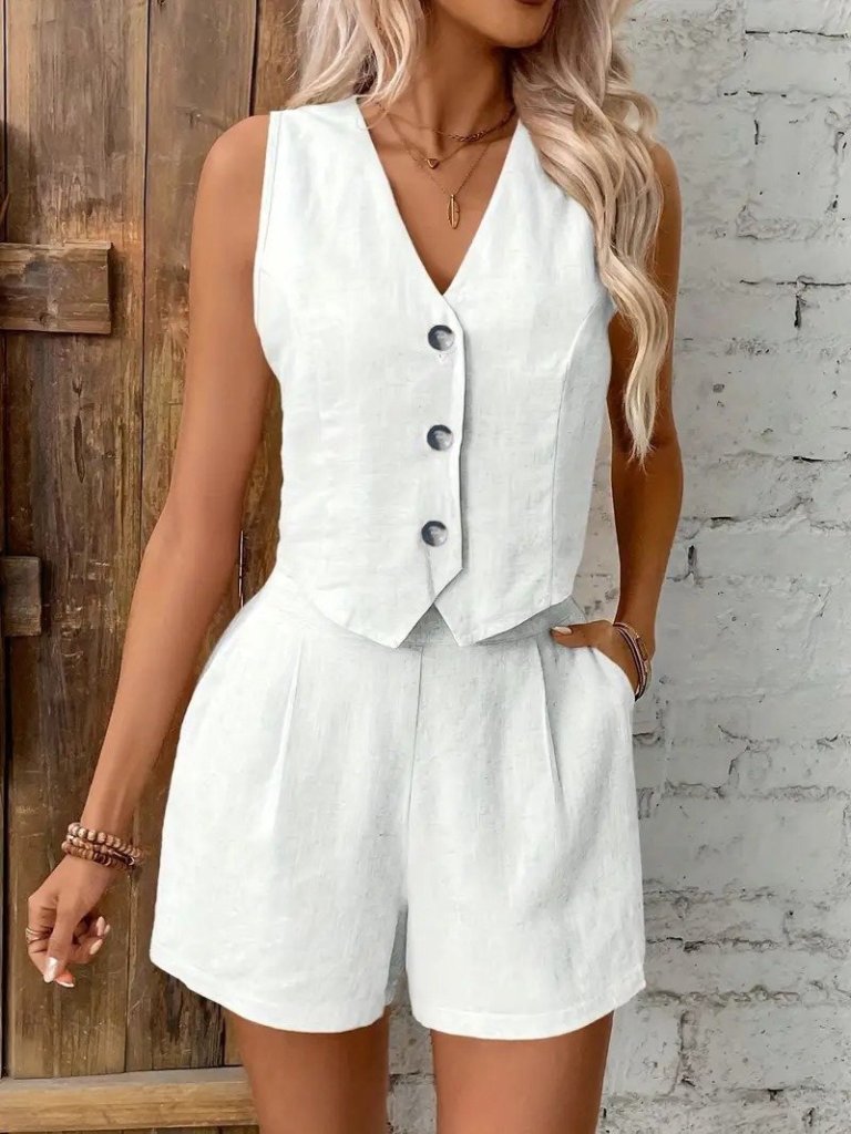 Kadın Sıfır Kol Askılı V Yakalı önden Düğmeli Ithal Keten Ceket Ve Short Ikili Takım