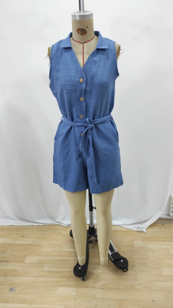 Kadın Sıfır Kollu Yakalı Düğmeli Belden Kuşaklı Kısa Keten Tulum