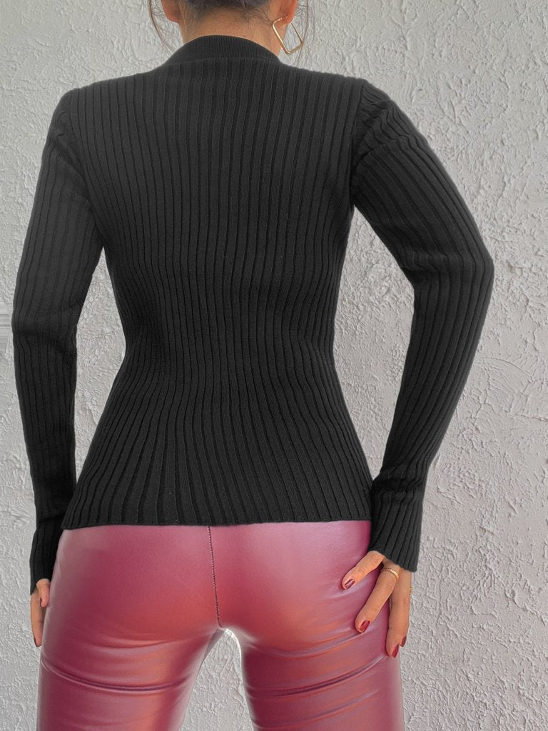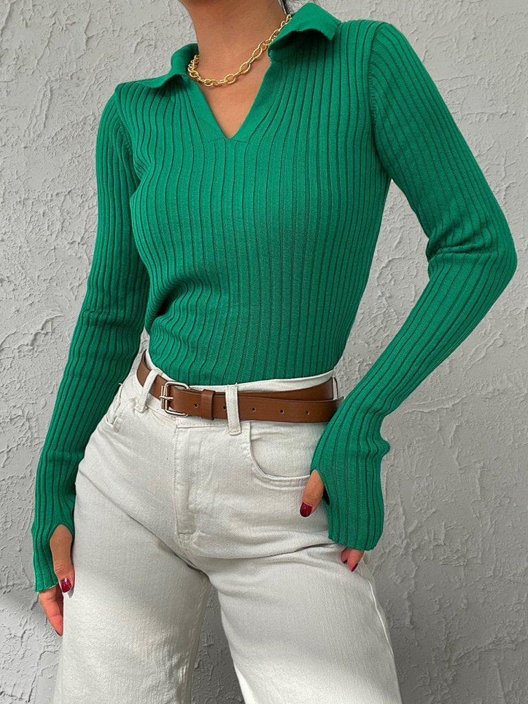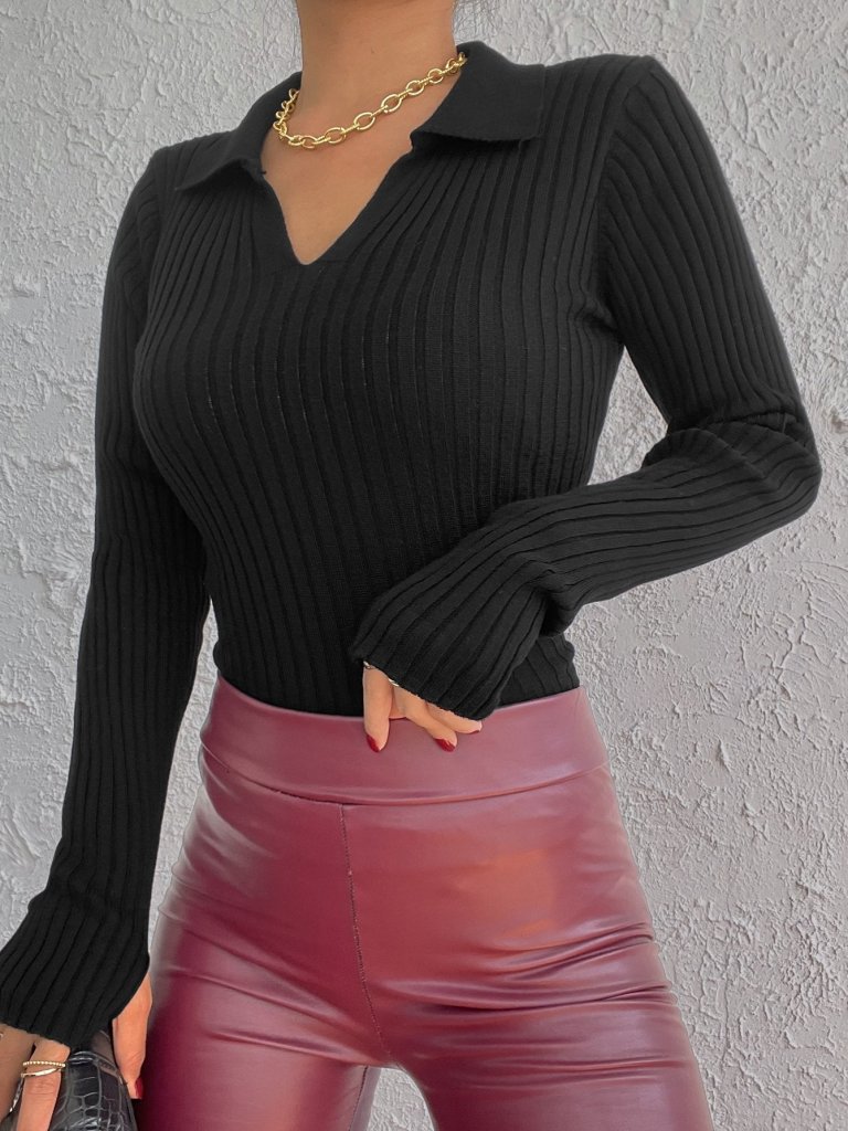 Kadın Siyah Polo Yaka Parmak Detay Triko Bluz 2047