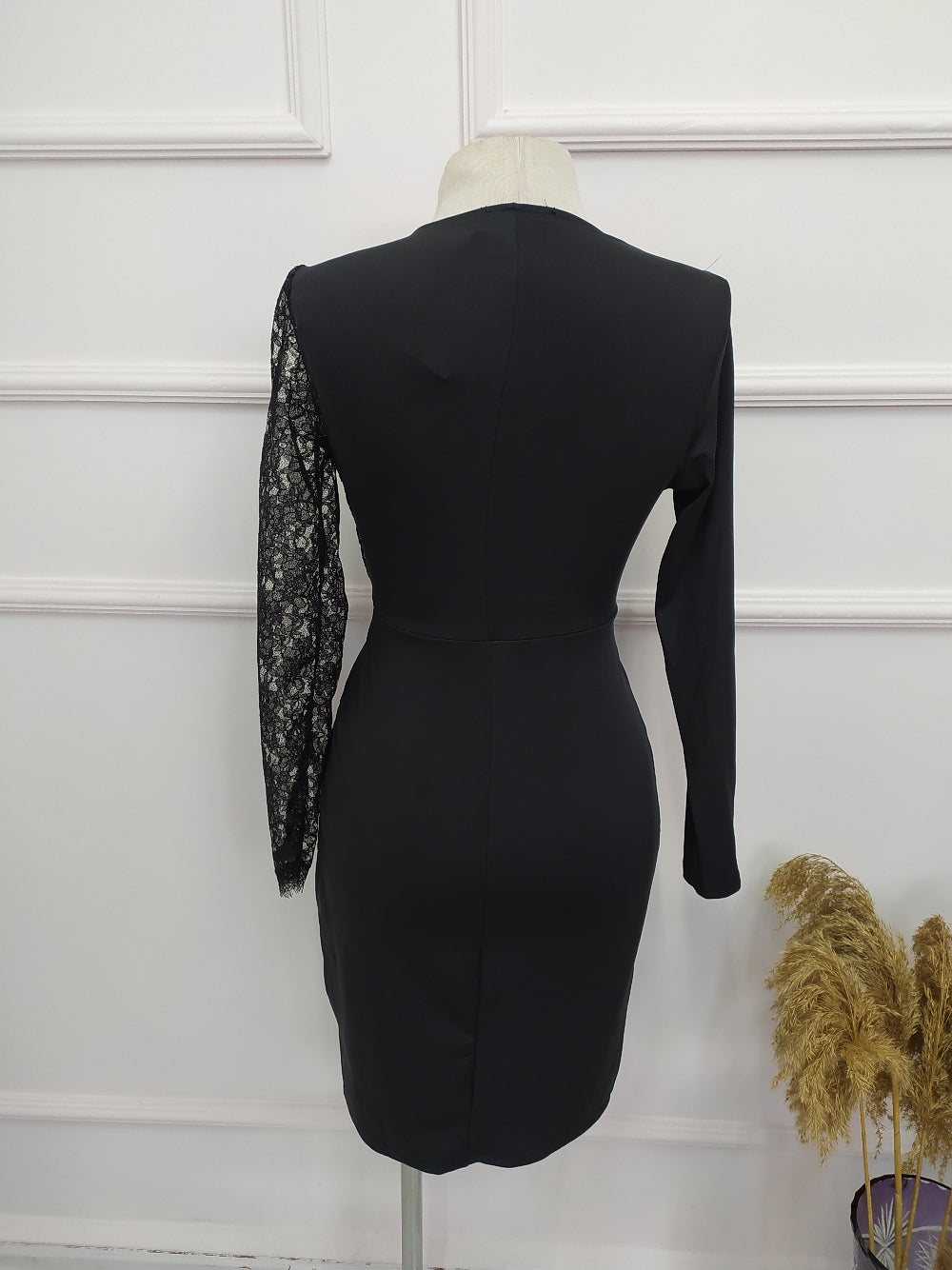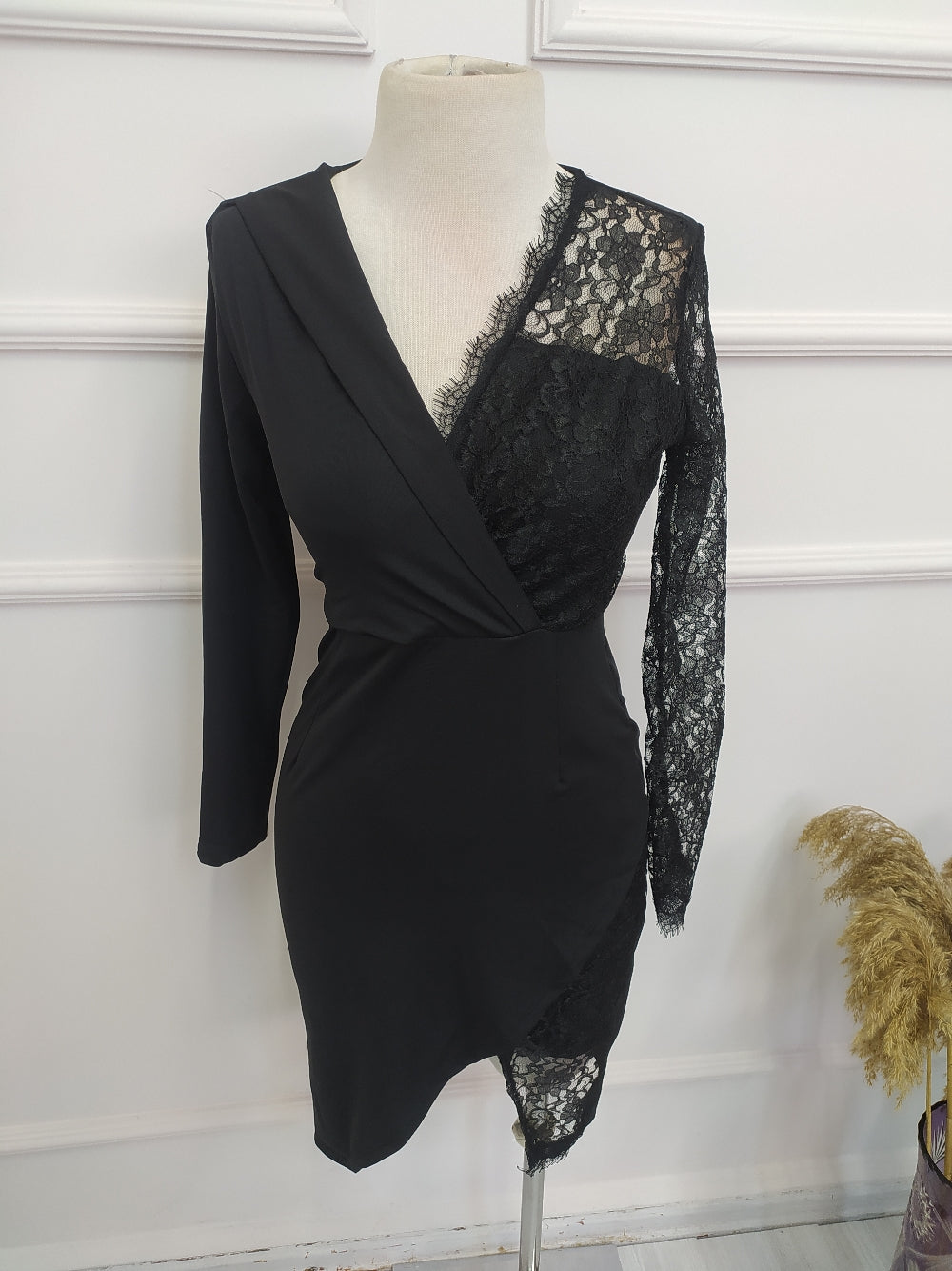 Kadın Siyah Uzun Kollu Tek Kolu Dantel Detay V Yakalı Yırtmaçlı Dalgıç Elbise