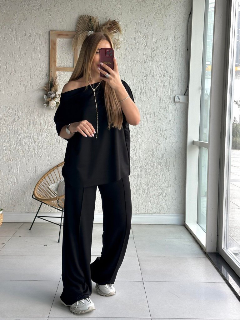 Kadın Tek Omuzdan Açık Geniş Kesim Viskon Iki Iplik Bluz Ve Pantolon Ikili Takım