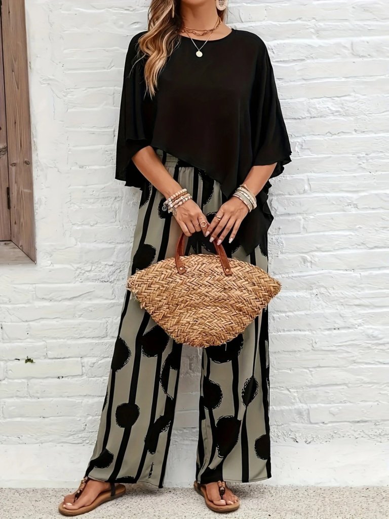 Kadın Truvakar Kol Bisiklet Yaka Asimetrik Dikişsiz Sandy Pelerin Bluz Ve Desenli Pantolon Ikili Takım
