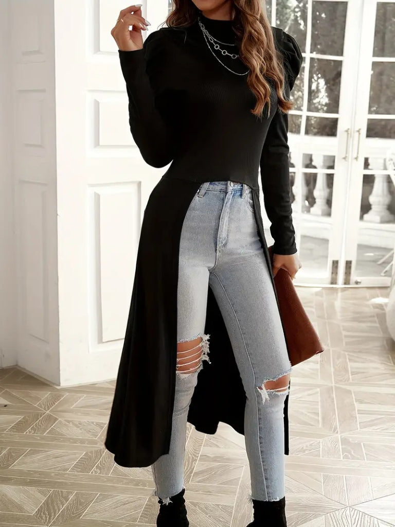 Kadın Uzun Balon Kollu Yarı Balıkçı Yaka önü Açık Kaşkorse Tunik