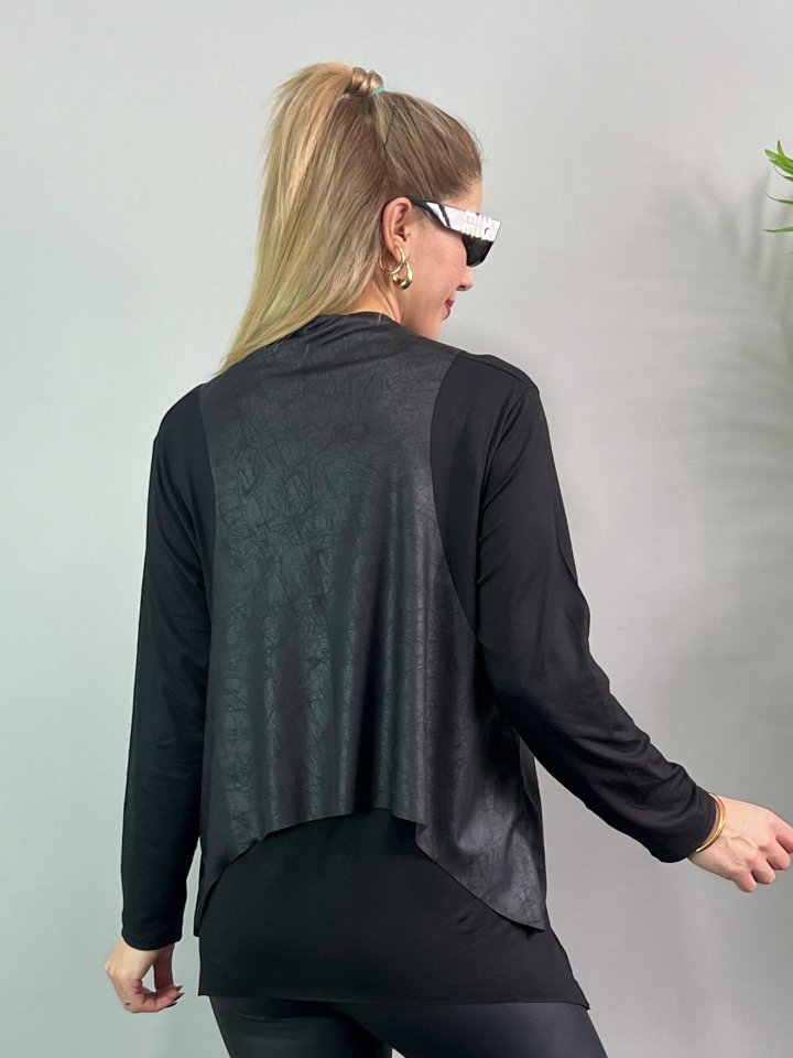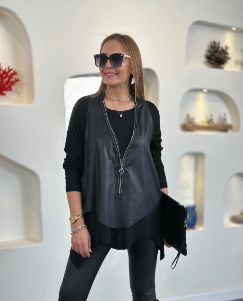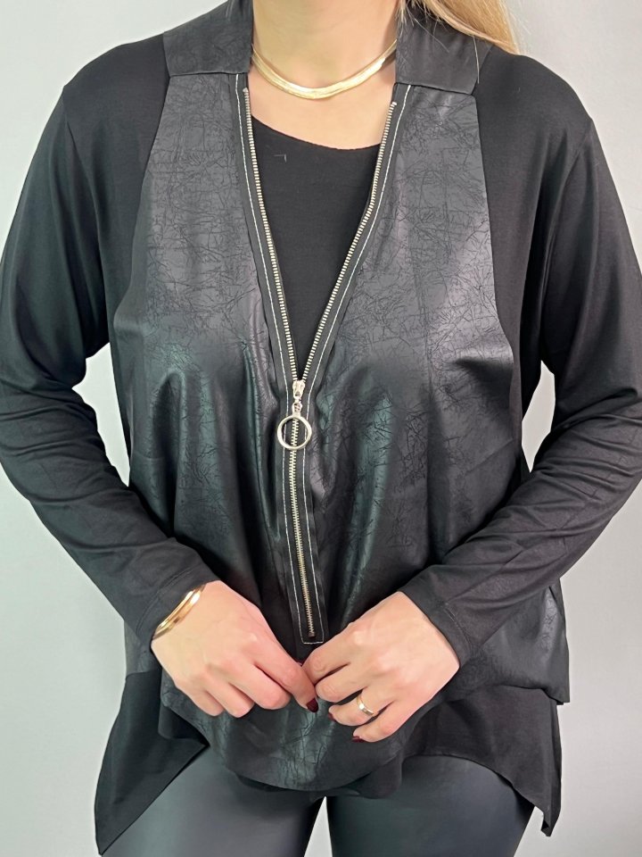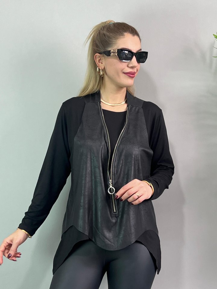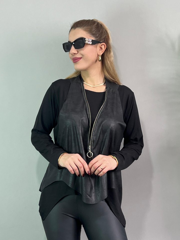 Kadın Uzun Kol Asimetrik Kesim Viskon Bluz Ve çatlak Deri Görünümlü Fermuar Detaylı Yelek Ikili Takım
