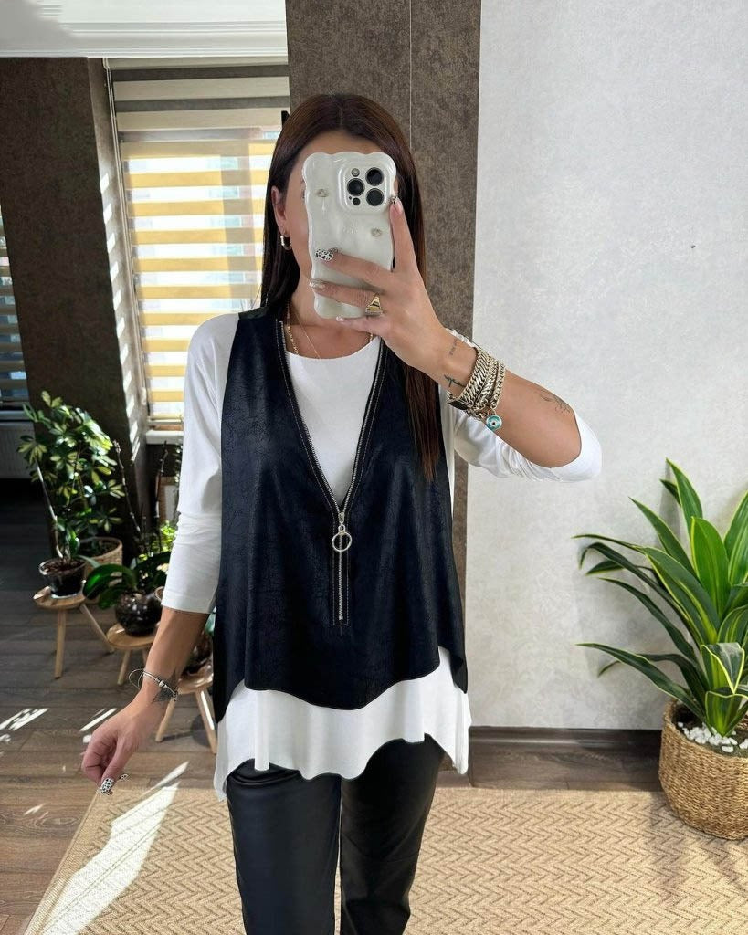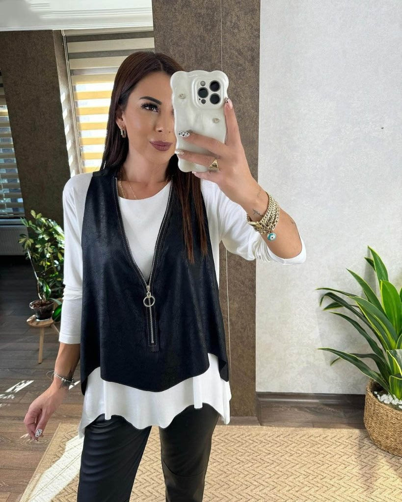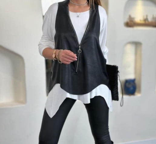 Kadın Uzun Kollu Asimetrik Kesim Viskon Bluz Ve çatlak Deri Görünümlü Yelek Ikili Takım
