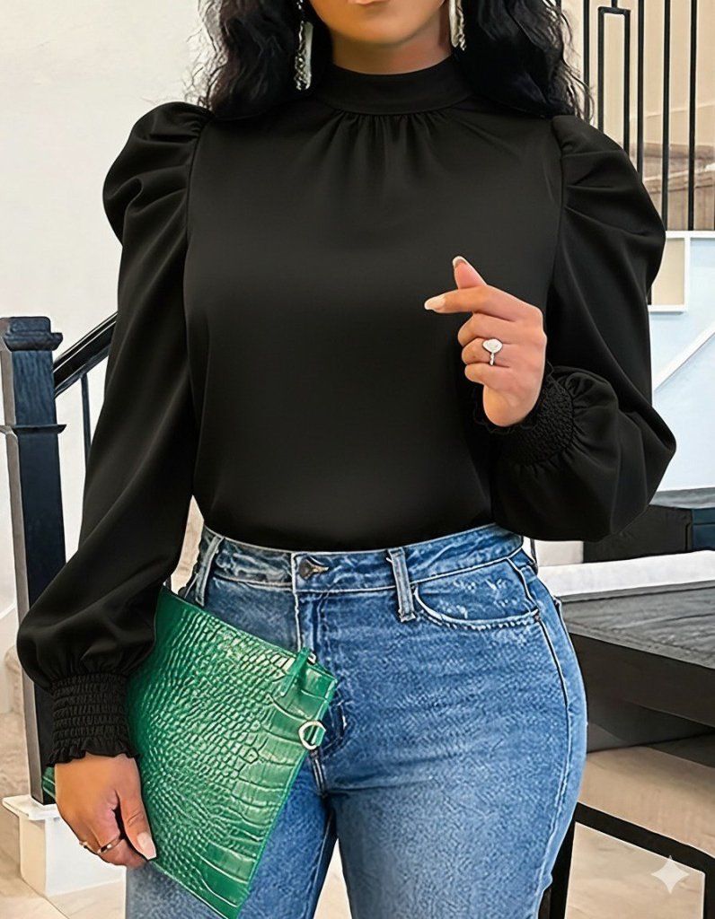 Kadın Uzun Kollu Balıkçı Yaka Arkadan Bağlamalı Omuzlardan Balon Ithal Krep Bluz