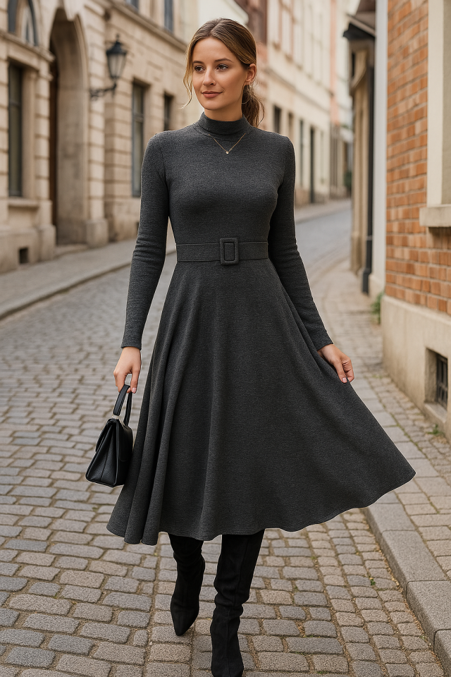 Kadın Uzun Kollu Balıkçı Yaka Kemer Detaylı Yumoş Midi Elbise