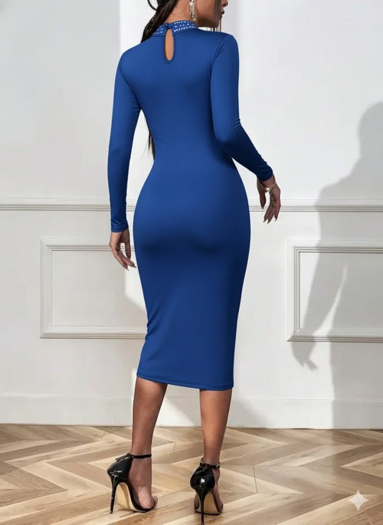 Kadın Uzun Kollu Balıkçı Yaka Taşlı Damla Detay Midi Ithal Krep Elbise