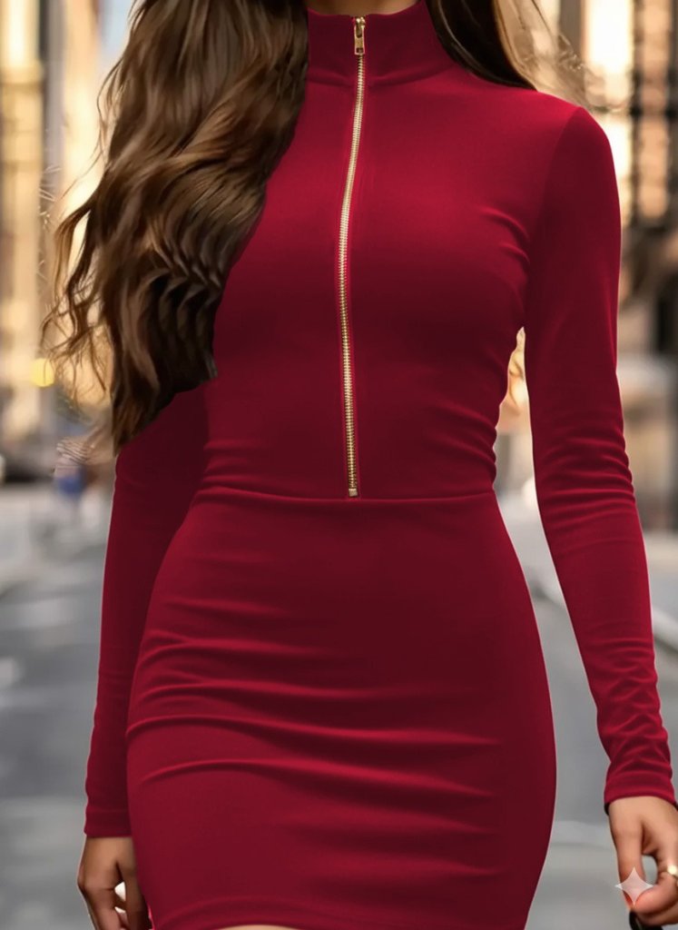 Kadın Uzun Kollu Balıkçı Yaka Yakadan Göğüse Kadar Fermuar Detaylı Mini Kadife Elbise