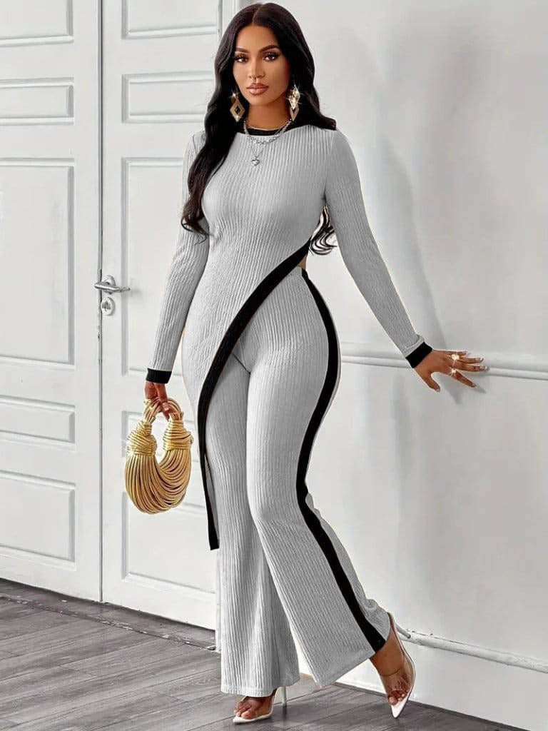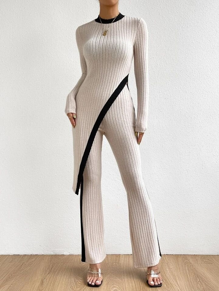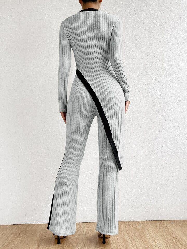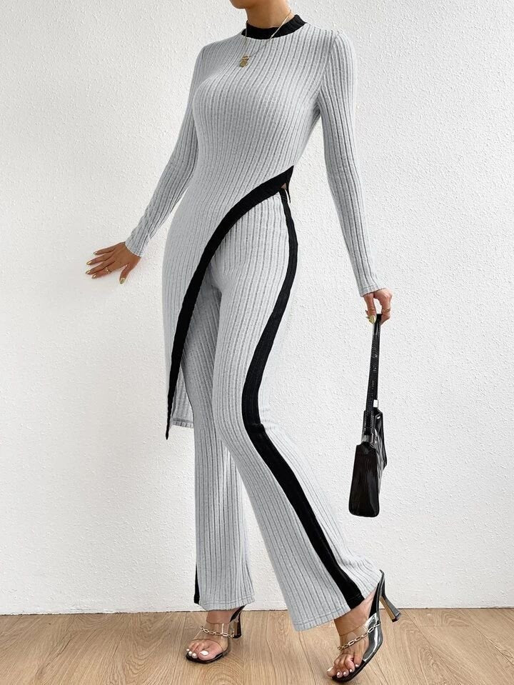 Kadın Uzun Kollu Bisiklet Yaka Asimetrik Kesim Bluz şardonlu Kaşkorse Bluz Ve Pantolon Ikili Takım