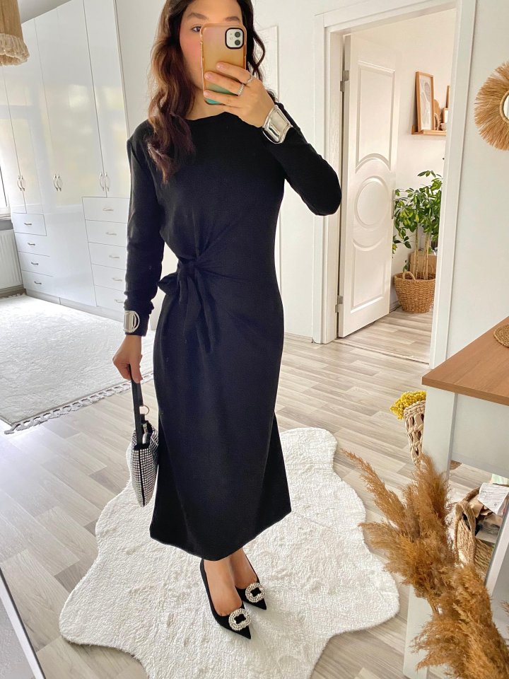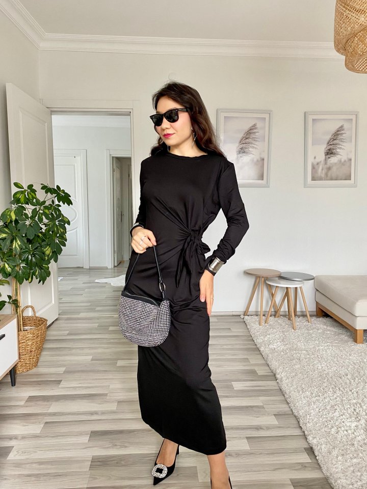 Kadın Uzun Kollu Bisiklet Yaka Belden çapraz Bağlamalı Yandan Yırtmaçlı Uzun Viskon Iki Iplik Elbise