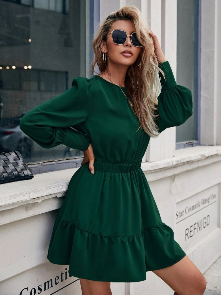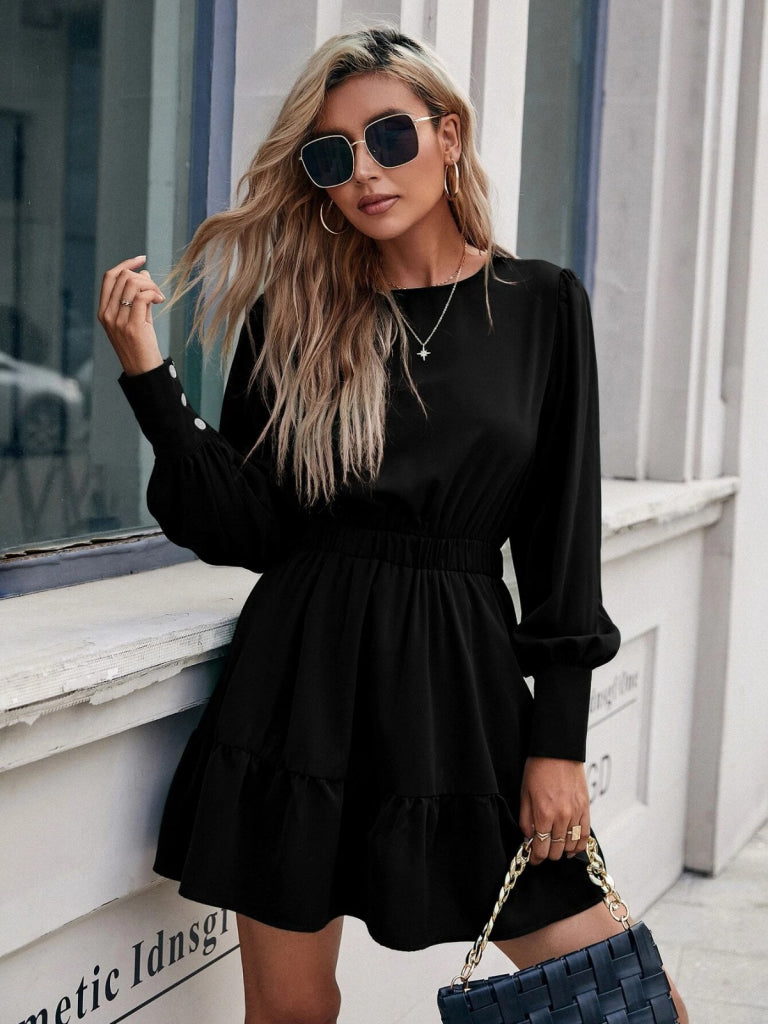 Kadın Uzun Kollu Bisiklet Yaka Beli Lastikli Fırfırlı Ithal Krep Elbise