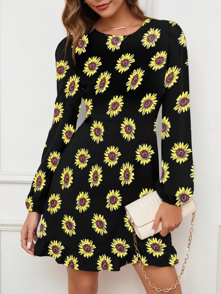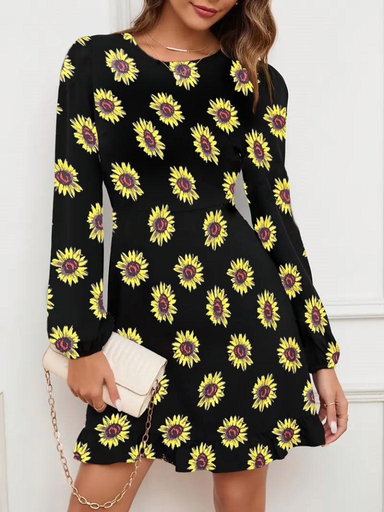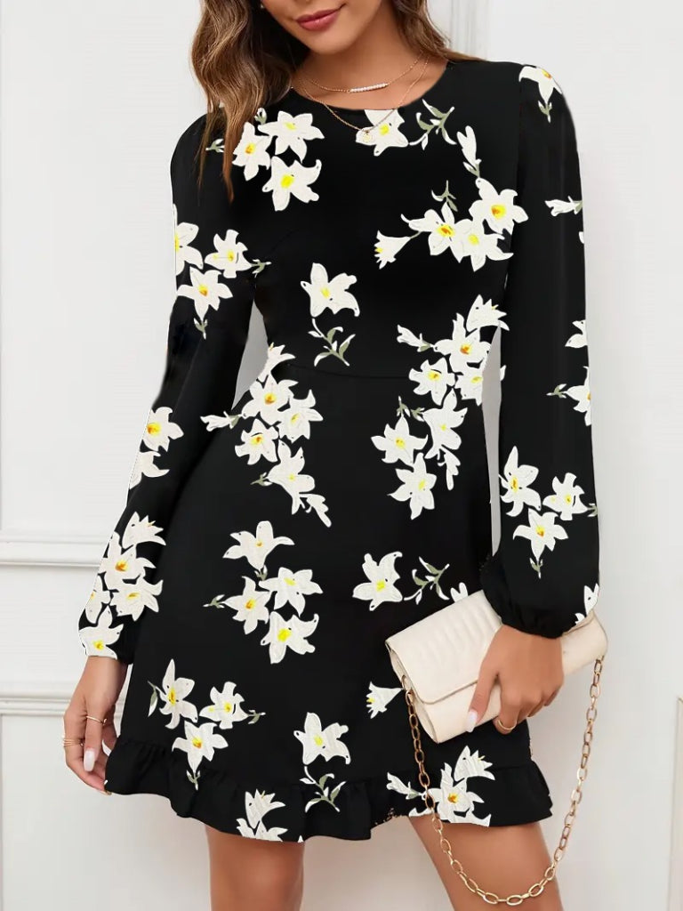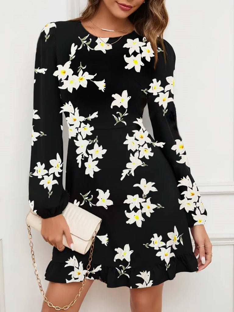Kadın Uzun Kollu Bisiklet Yaka Desenli Kısa Krep Elbise