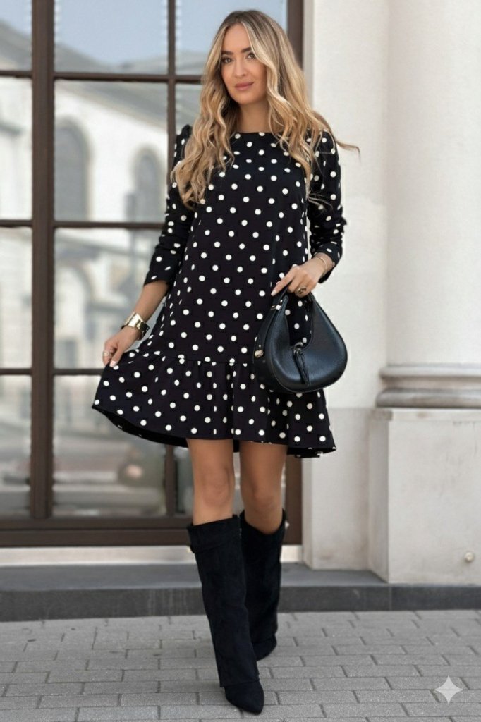 Kadın Uzun Kollu Bisiklet Yaka Fırfırlı Puantiyeli Kısa Modal Elbise