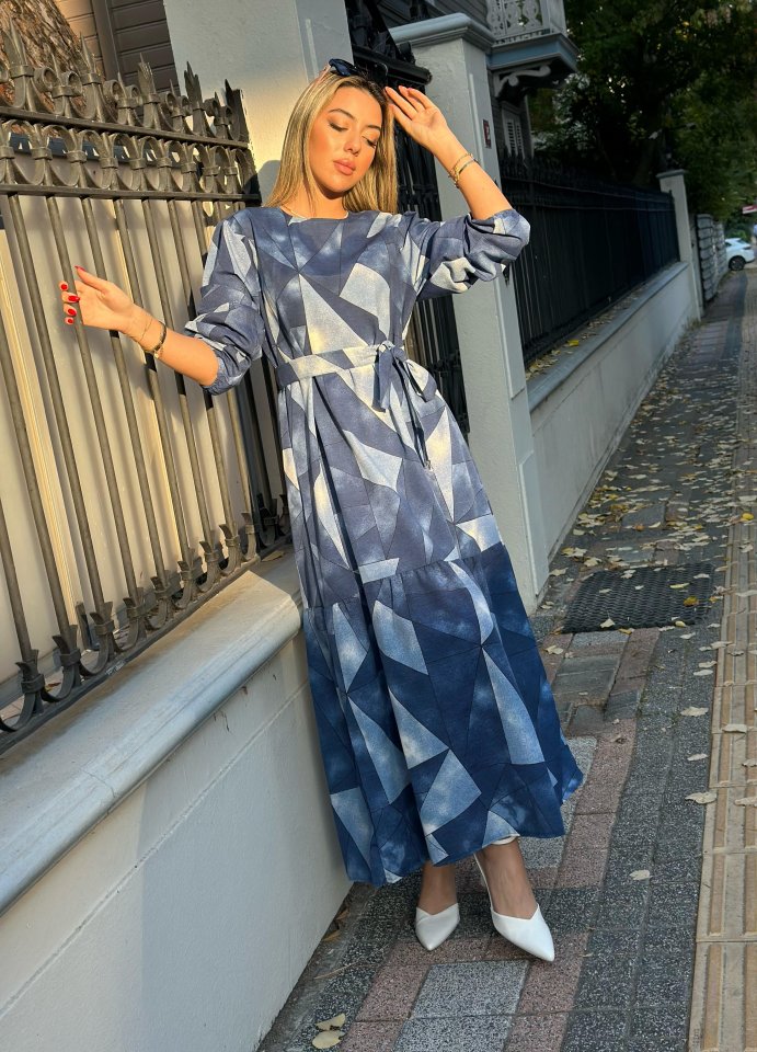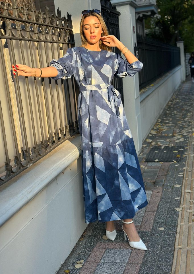 Kadın Uzun Kollu Bisiklet Yaka Geometrik Desen Baskılı Kuşak Dahil Maxi Boy Elbise