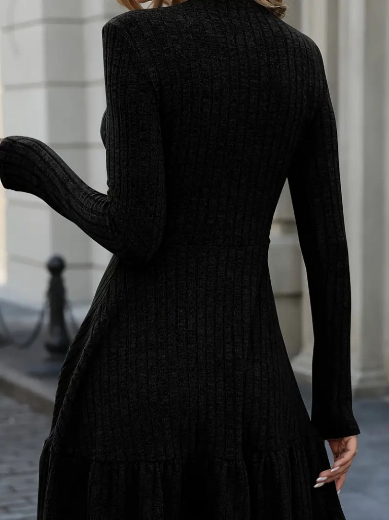 Kadın Uzun Kollu Bisiklet Yaka Kemersiz Eteği Pileli şardonlu Kaşkorse Elbise