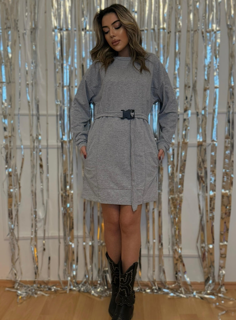 Kadın Uzun Kollu Bisiklet Yaka Kuşaklı Iki Iplik Elbise