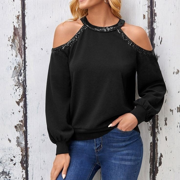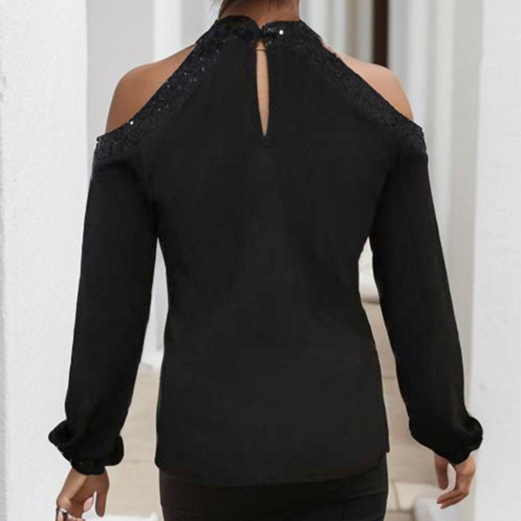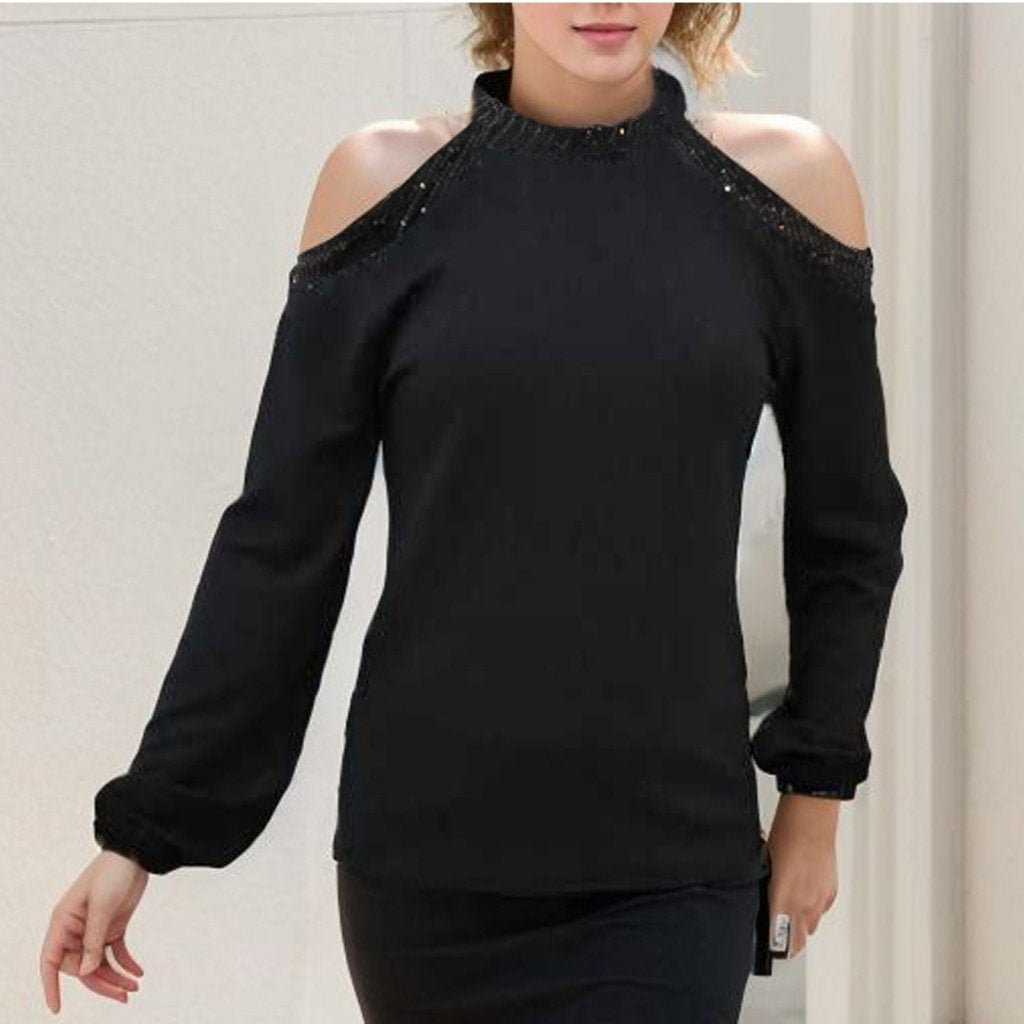 Kadın Uzun Kollu Bisiklet Yaka Omuz Açık Detaylı Krep Bluz