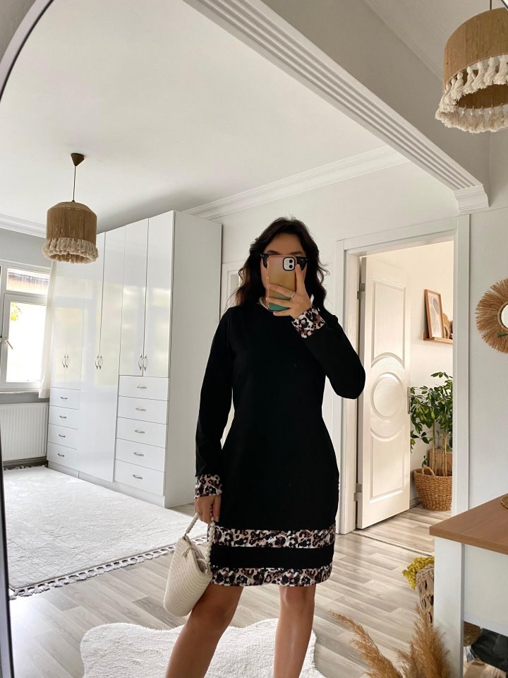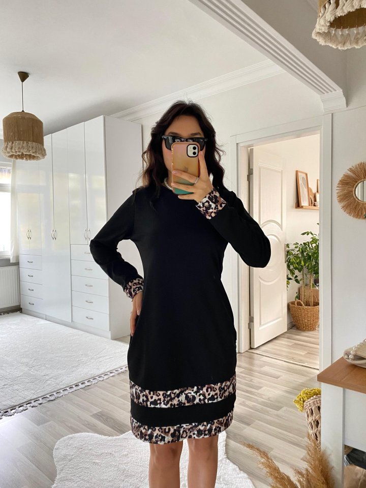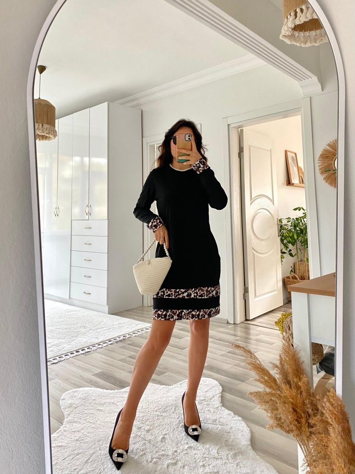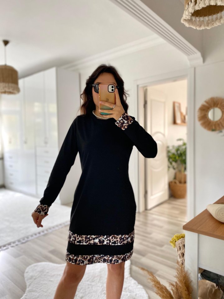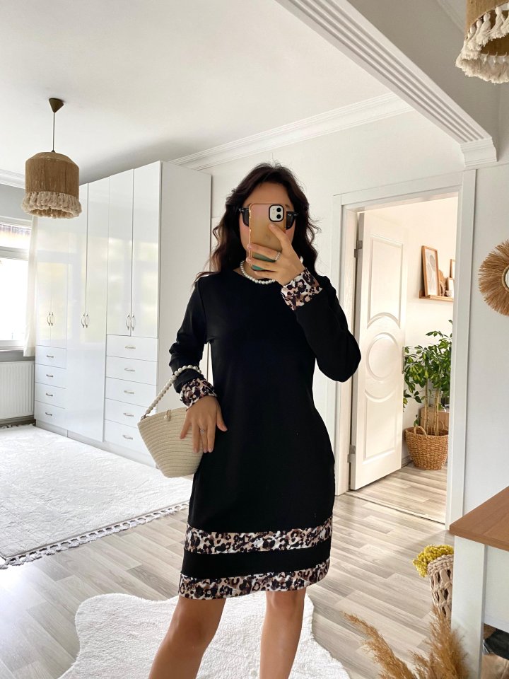 Kadın Uzun Kollu Bisiklet Yaka şerit Leopar Desenli Dalgıç Elbise