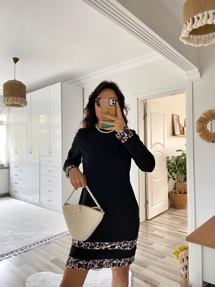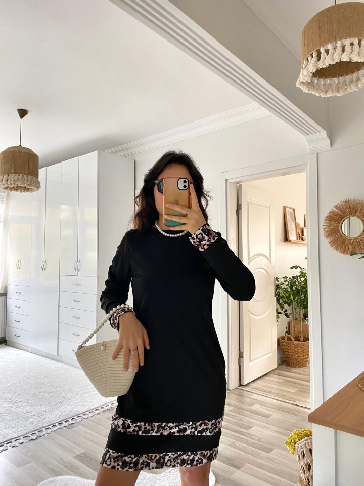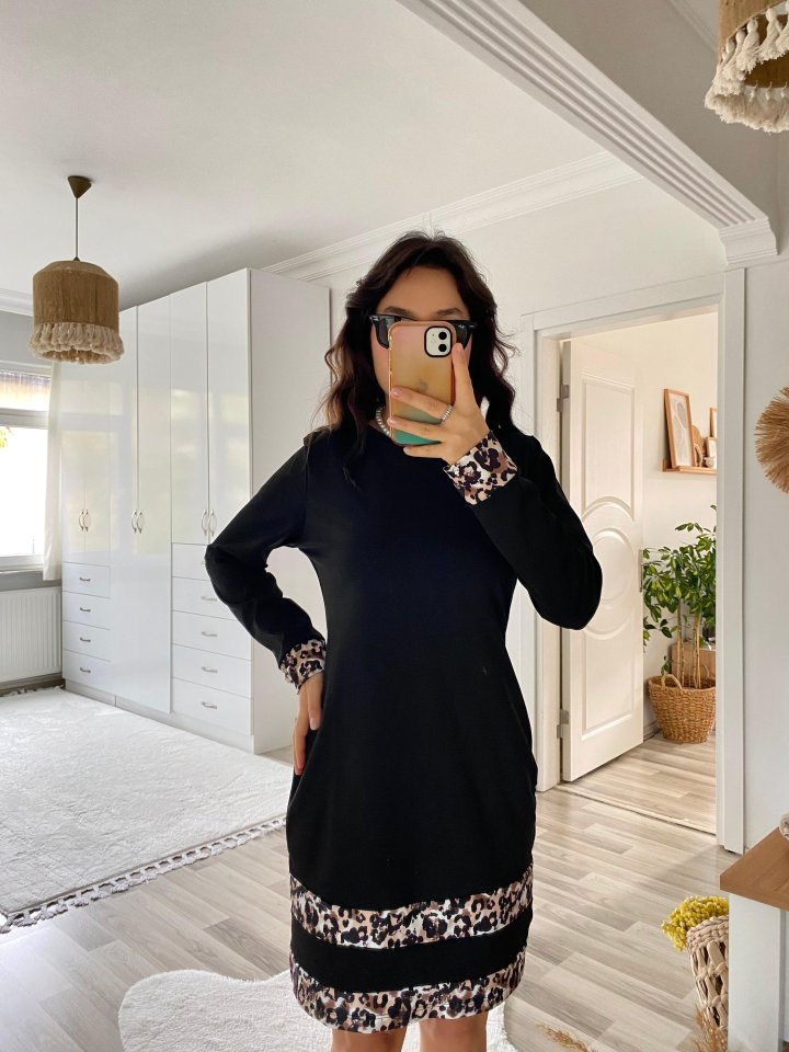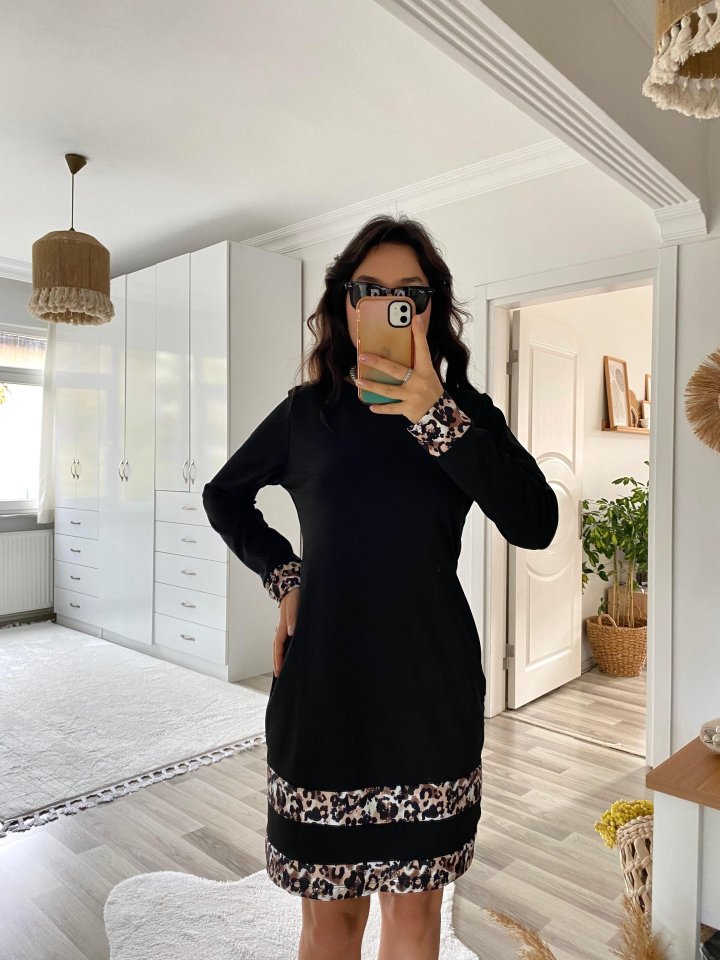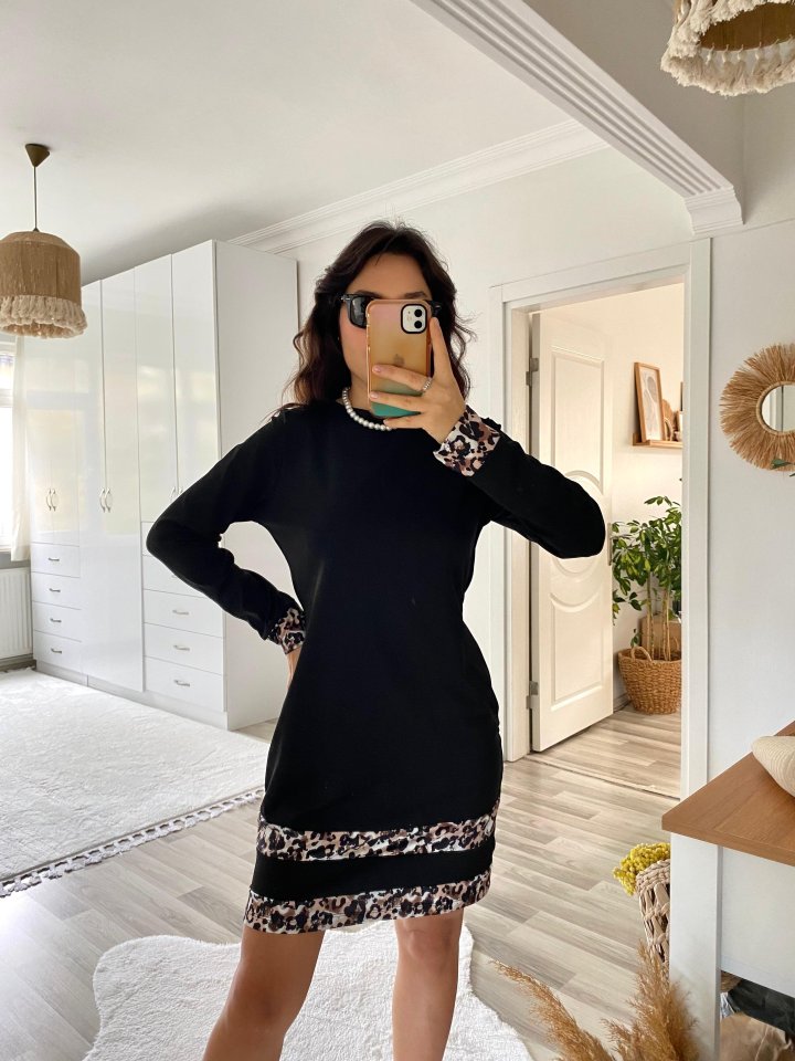 Kadın Uzun Kollu Bisiklet Yaka şerit Leopar Desenli Dalgıç Elbise