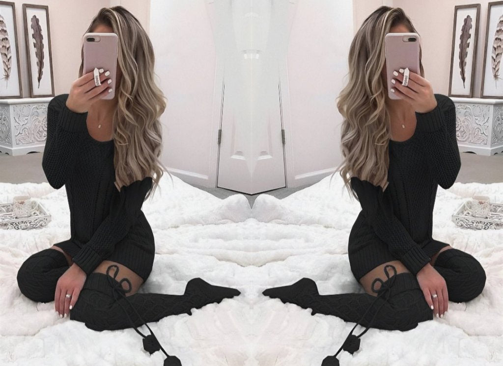 Kadın Uzun Kollu Bisiklet Yaka Triko Elbise (çorapsız)