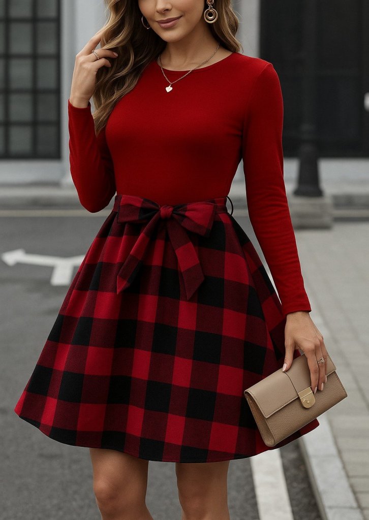Kadın Uzun Kollu Bisiklet Yaka üst Viskon Alt Ekose Kısa Elbise