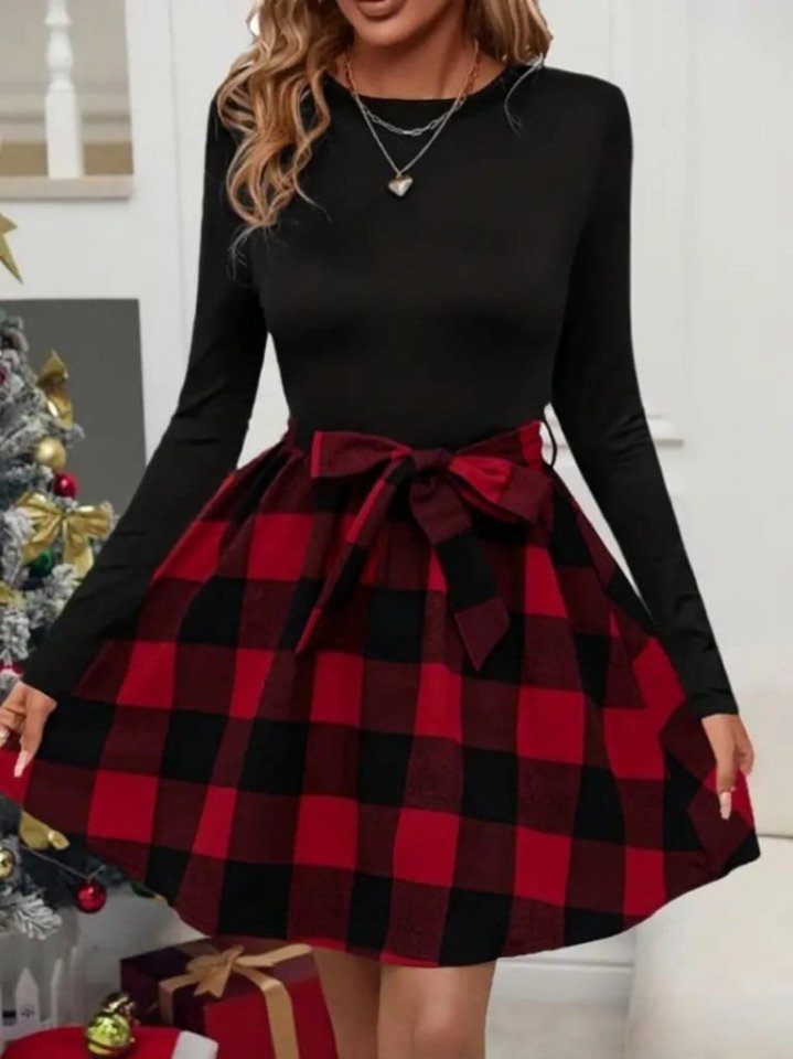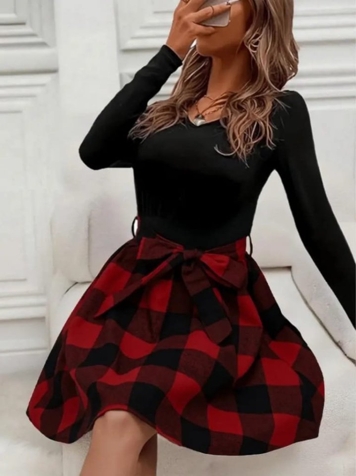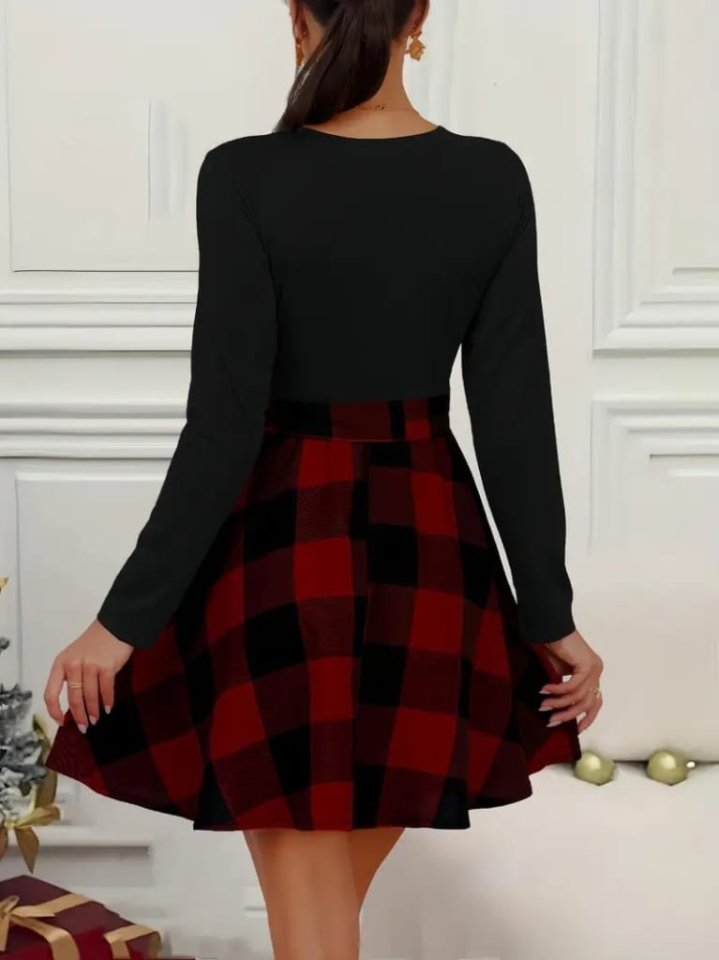 Kadın Uzun Kollu Bisiklet Yaka üst Viskon Alt Ekose Kısa Elbise