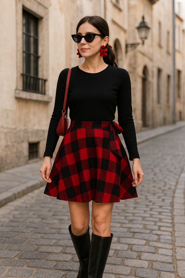 Kadın Uzun Kollu Bisiklet Yaka üst Viskon Alt Ekose Kısa Elbise
