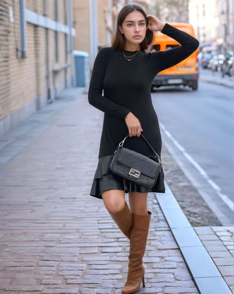 Kadın Uzun Kollu Bisiklet Yaka üst Viskon Etek Ucu Deri Kısa Elbise