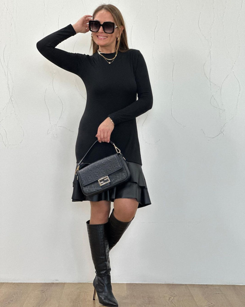 Kadın Uzun Kollu Bisiklet Yaka üst Viskon Etek Ucu Deri Kısa Elbise