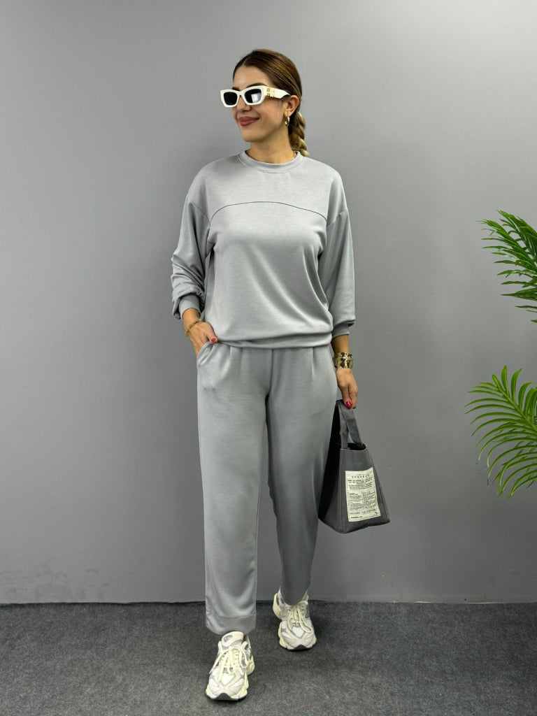 Kadın Uzun Kollu Bisiklet Yaka Viskon Iki Iplik Bluz Ve Pantolon Ikili Takım