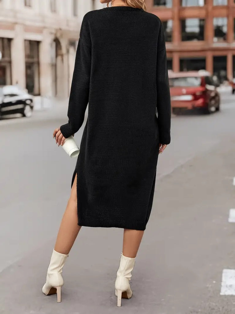 Kadın Uzun Kollu Bisiklet Yaka Yandan Yırtmaçlı Midi Triko Elbise(kemersiz)