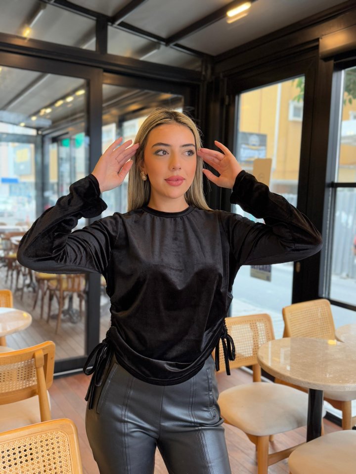 Kadın Uzun Kollu Bisiklet Yaka Yanları Ve Kolları Büzgülü Kadife Bluz
