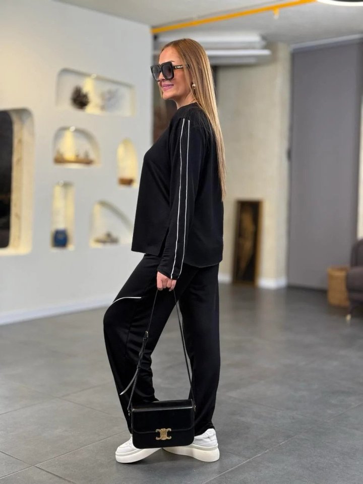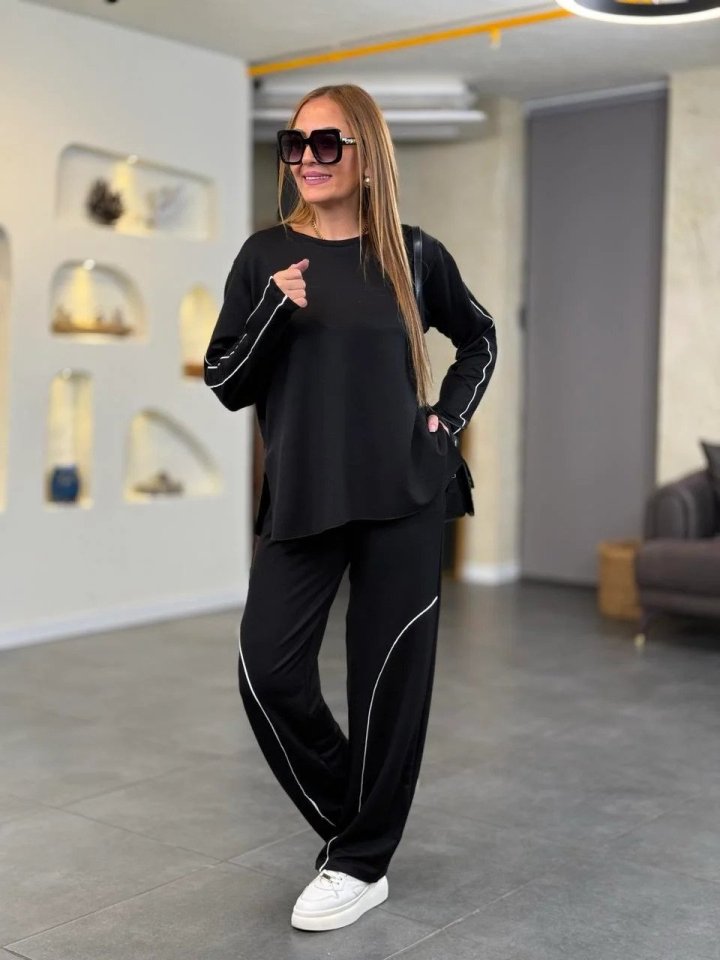 Kadın Uzun Kollu Biye Detay Modal Kumaş Salaş Ikili Takım