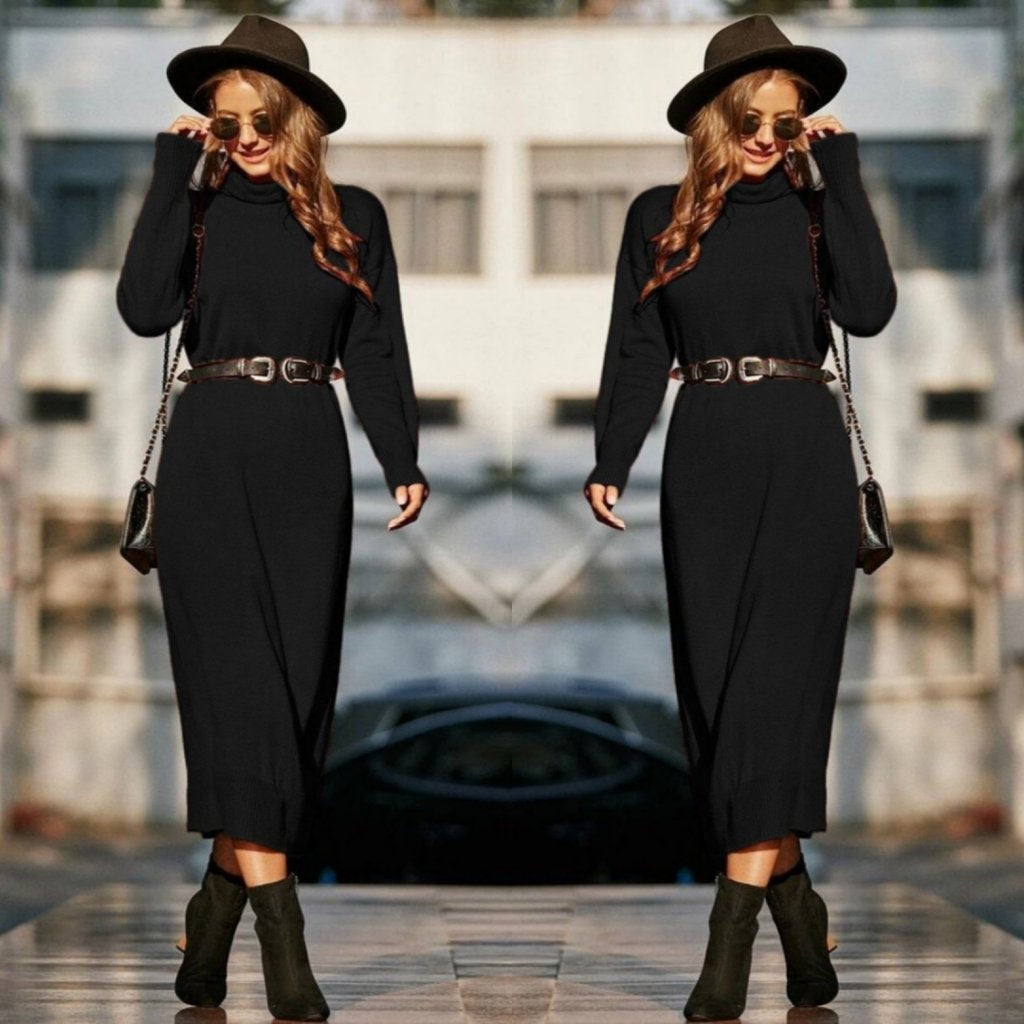 Kadın Uzun Kollu Boğazlı Midi Boy Triko Elbise (kemersiz)