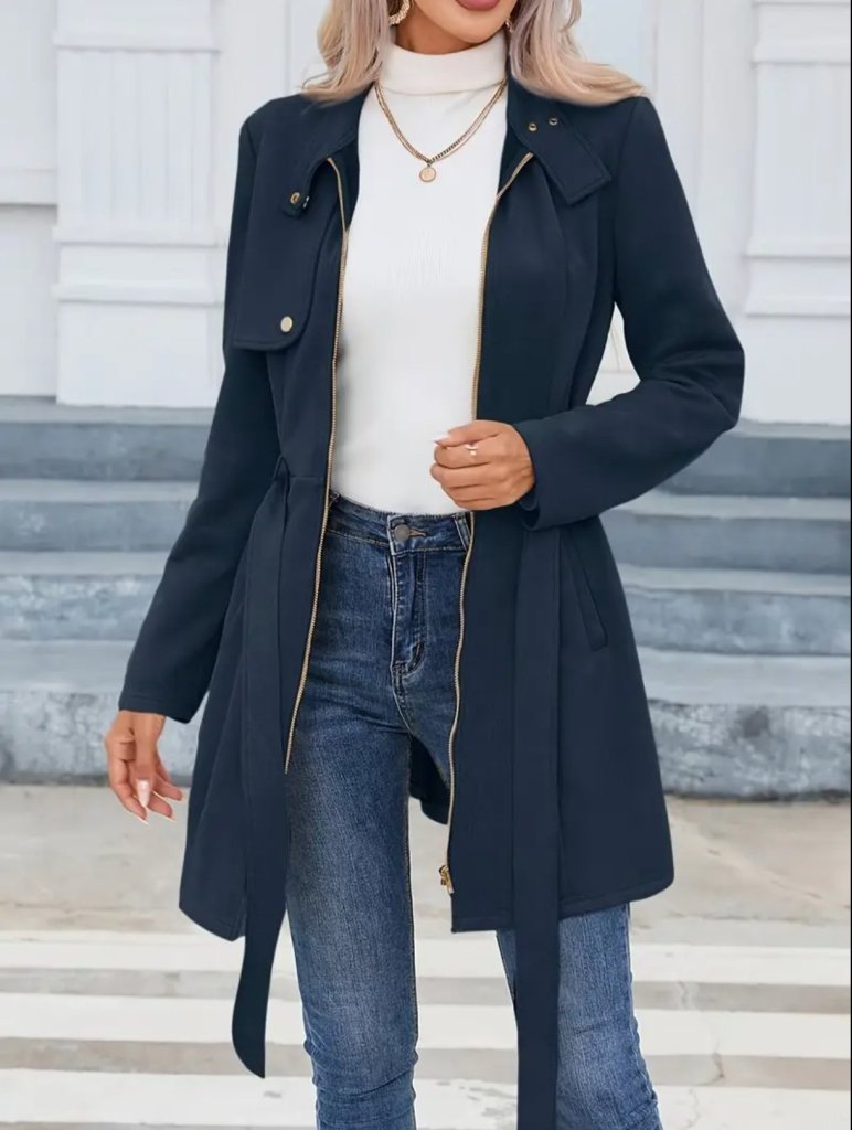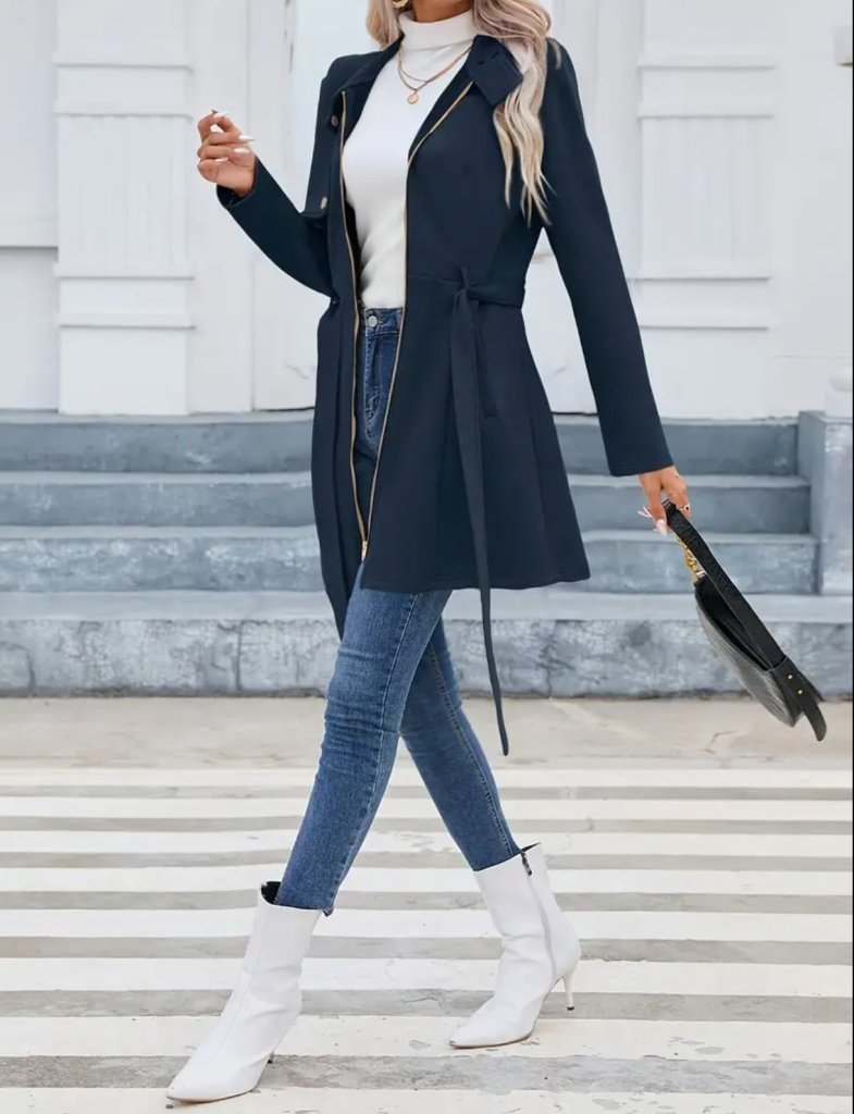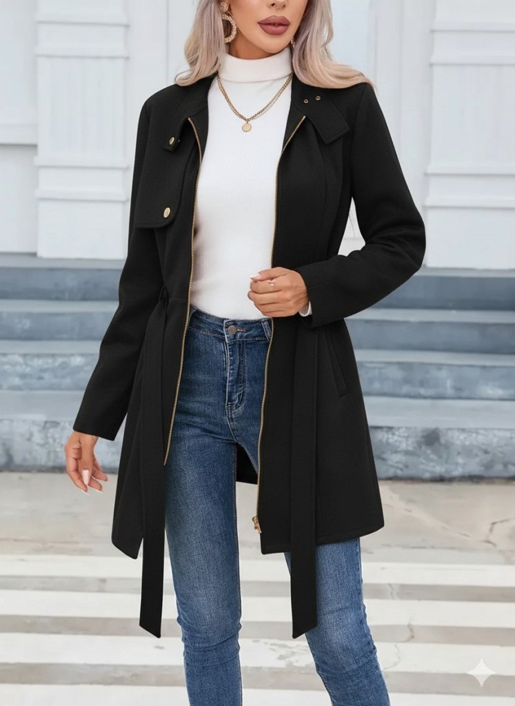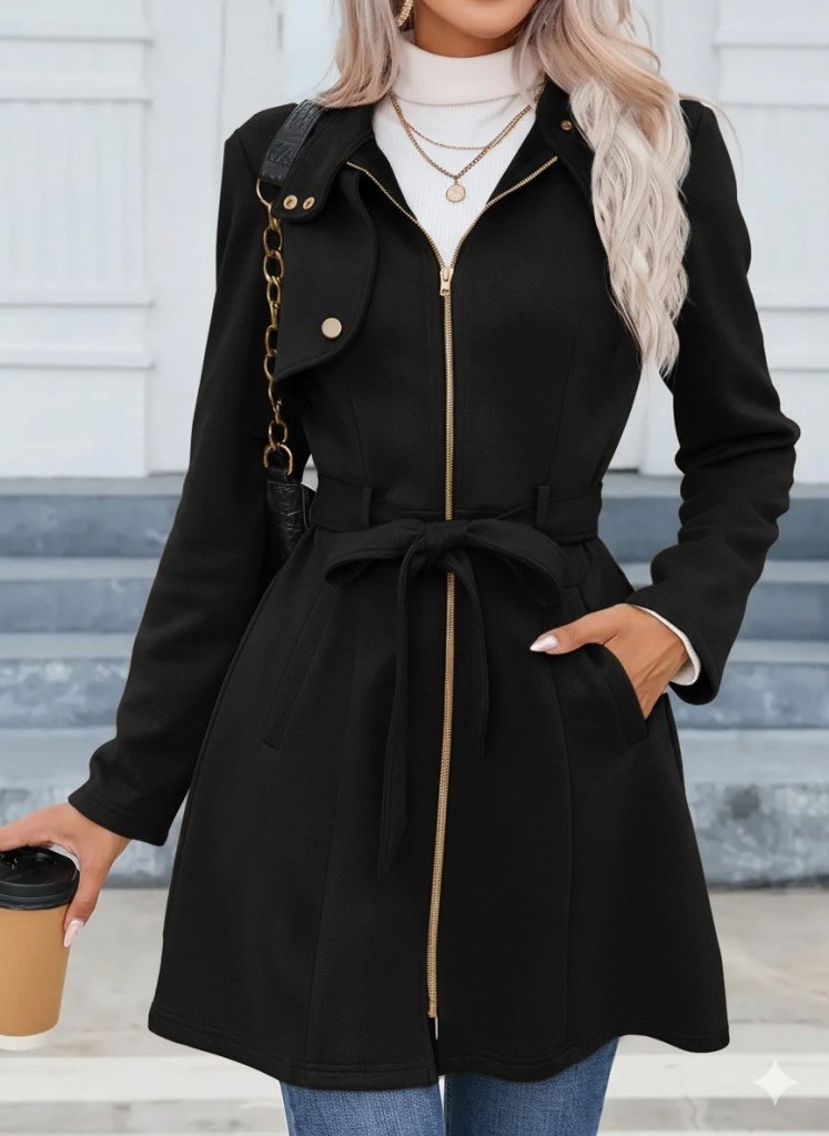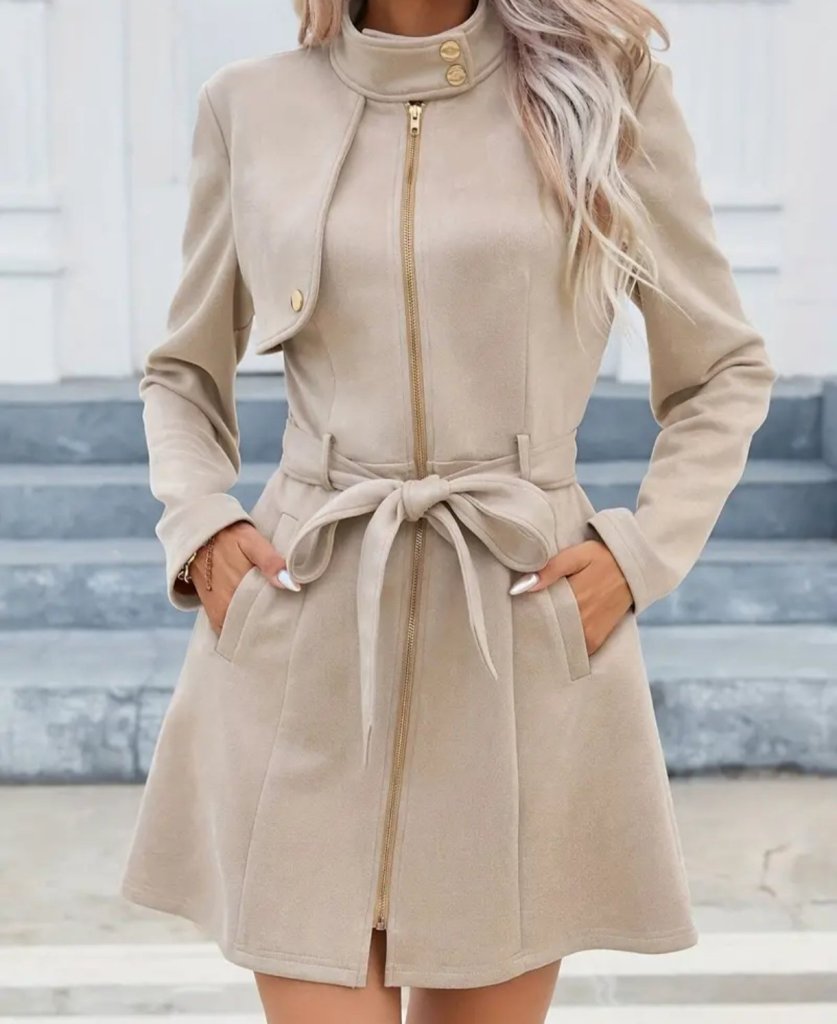 Kadın Uzun Kollu Boyundan Düğmeli Fermuarlı Beli Kuşaklı Süet Ceket