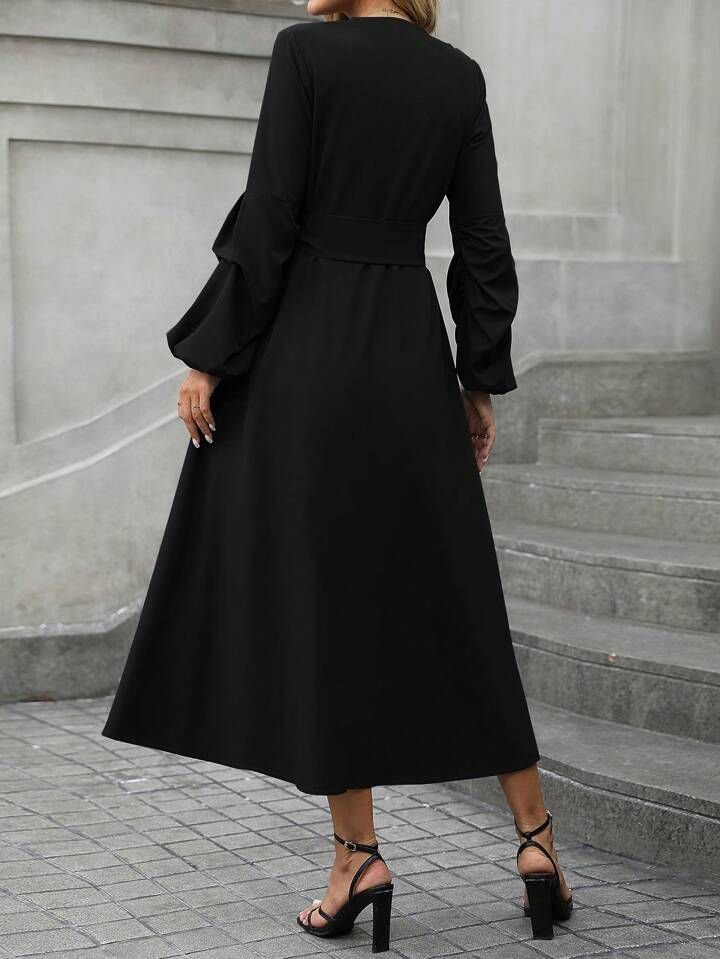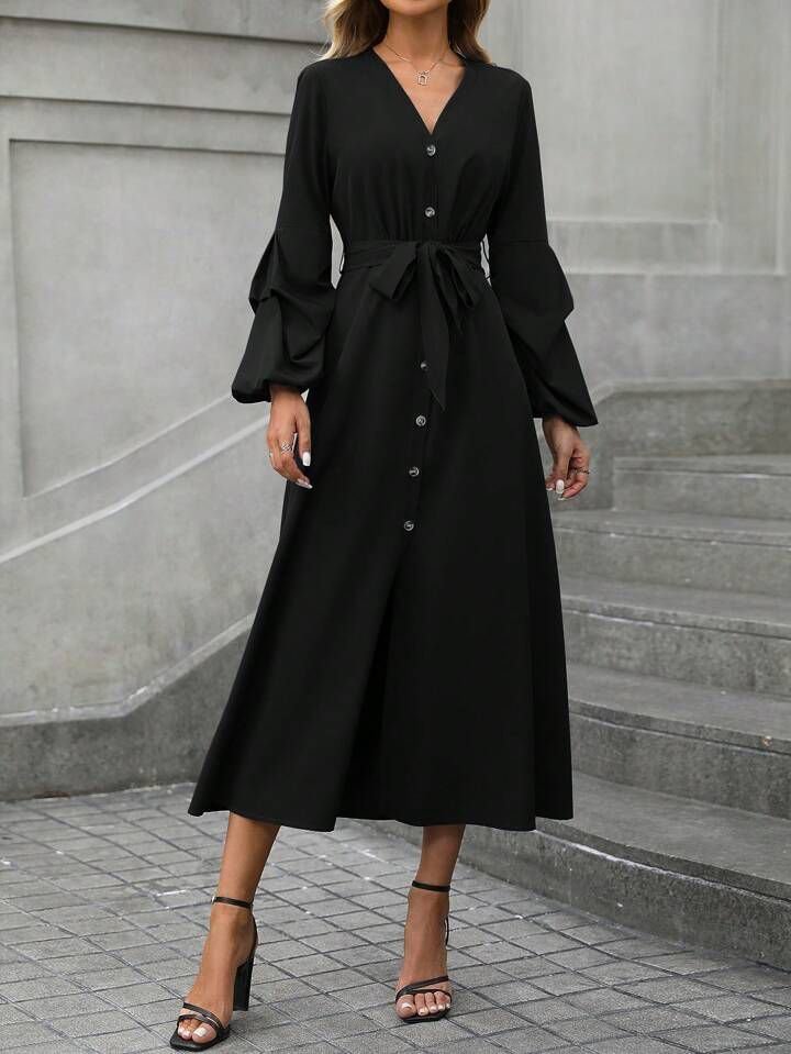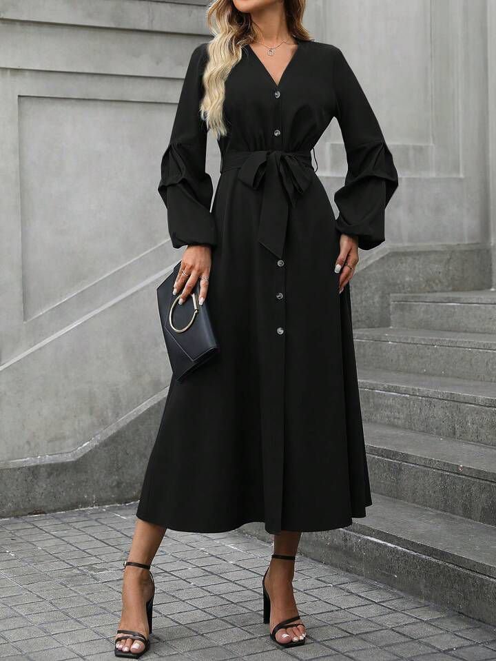Kadın Uzun Kollu Derin V Yakalı Belden Kuşaklı önden Düğmeli Janjan Krep Elbise