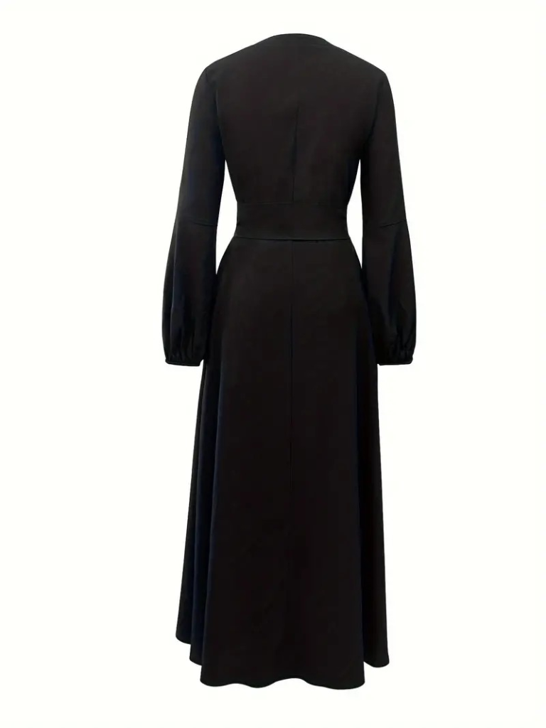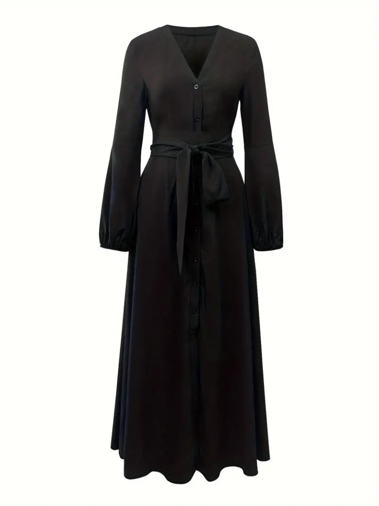 Kadın Uzun Kollu Derin V Yakalı Belden Kuşaklı önden Düğmeli Janjan Krep Elbise