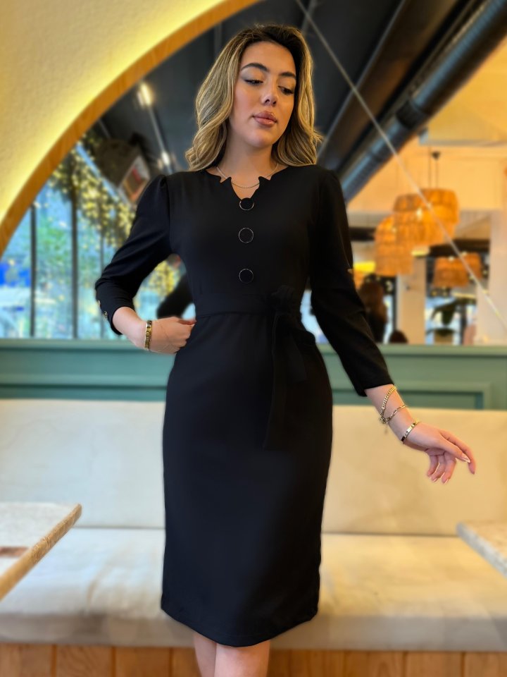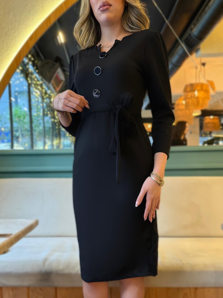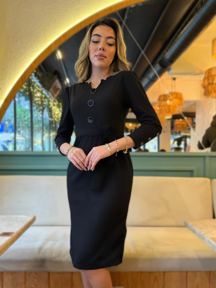 Kadın Uzun Kollu Düğme Detaylı Kendinden Kemerli Ithal Krep Elbise