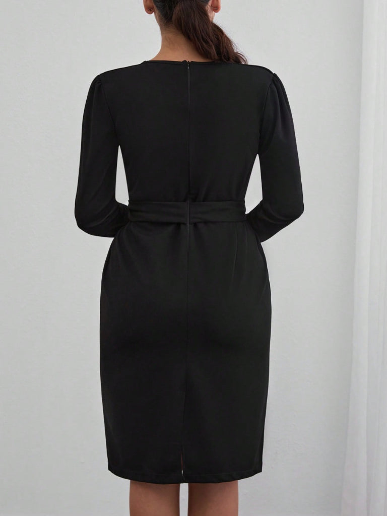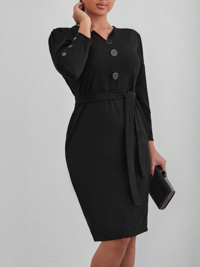 Kadın Uzun Kollu Düğme Detaylı Kendinden Kemerli Ithal Krep Elbise