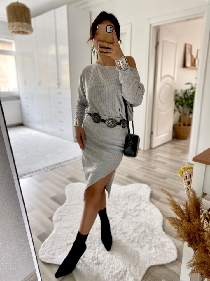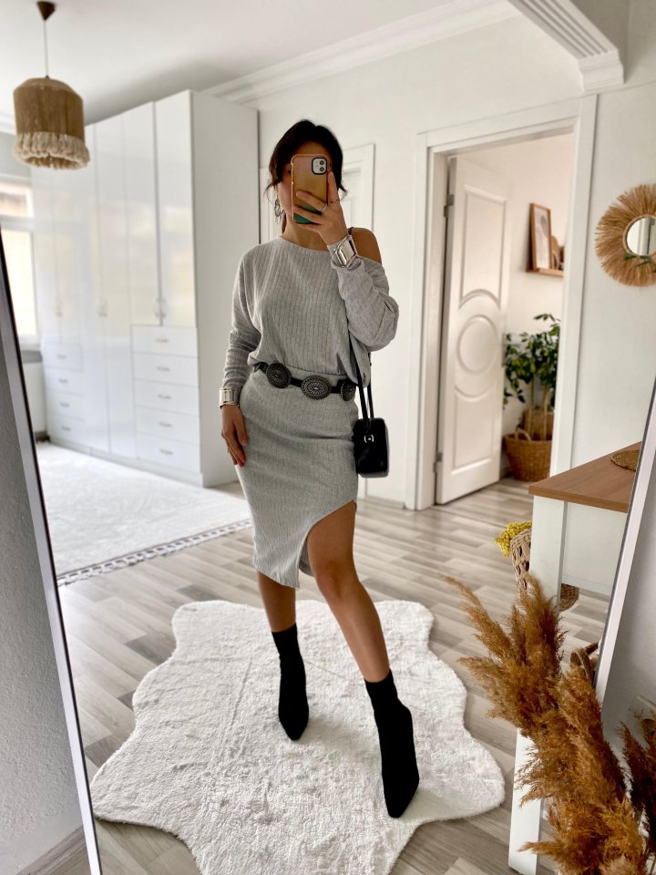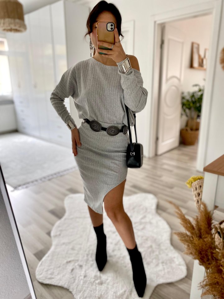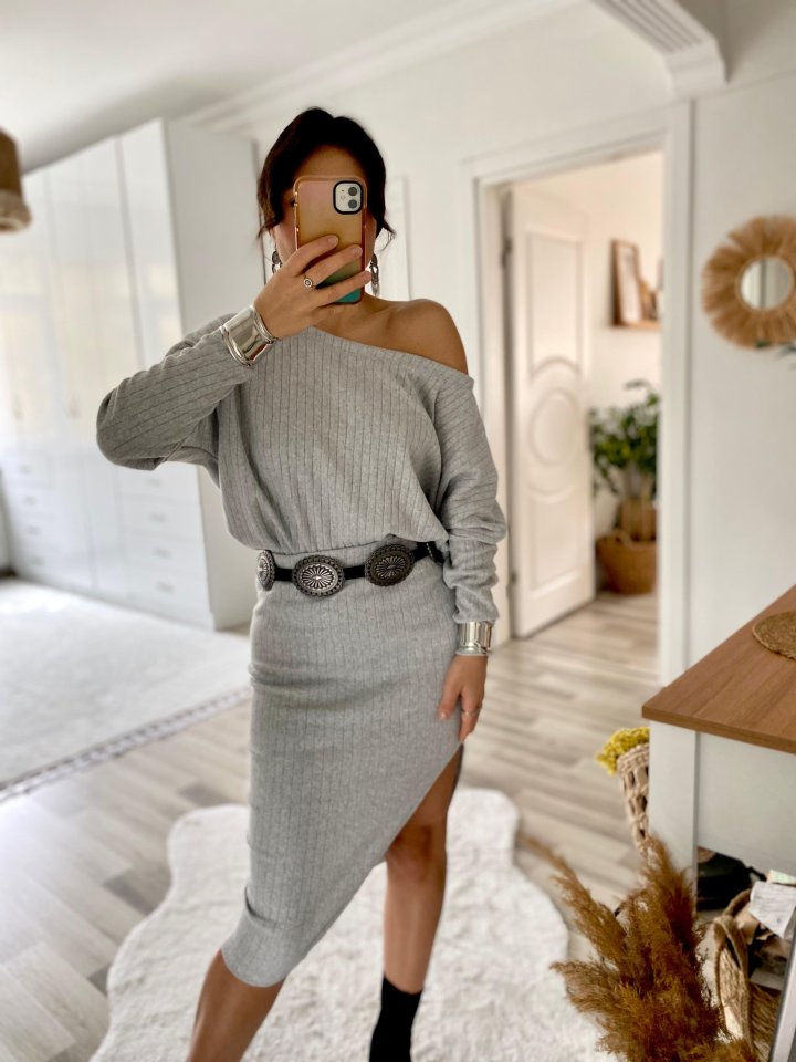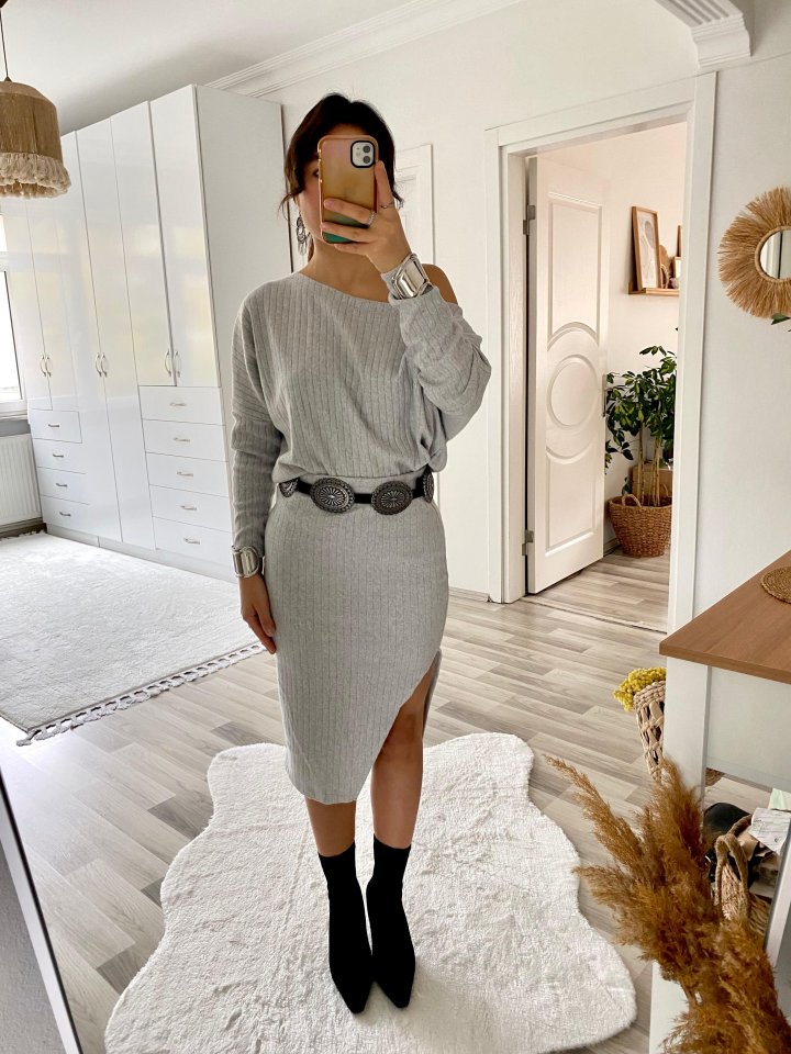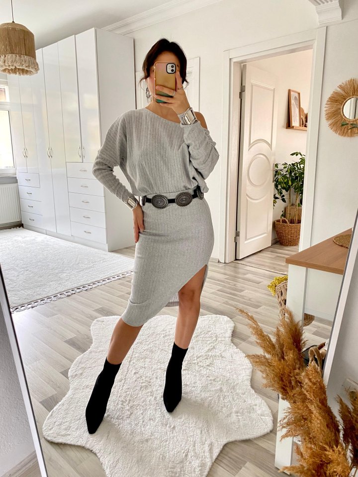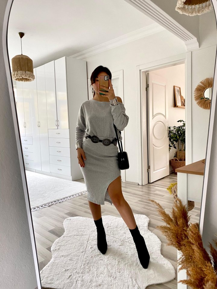 Kadın Uzun Kollu Düşük Omuz Yırtmaç Detay Kaşkorse Etek Bluz Ikili Takım