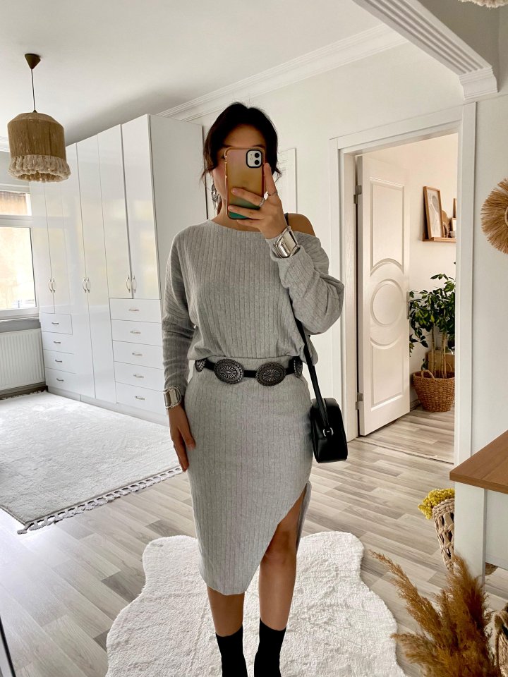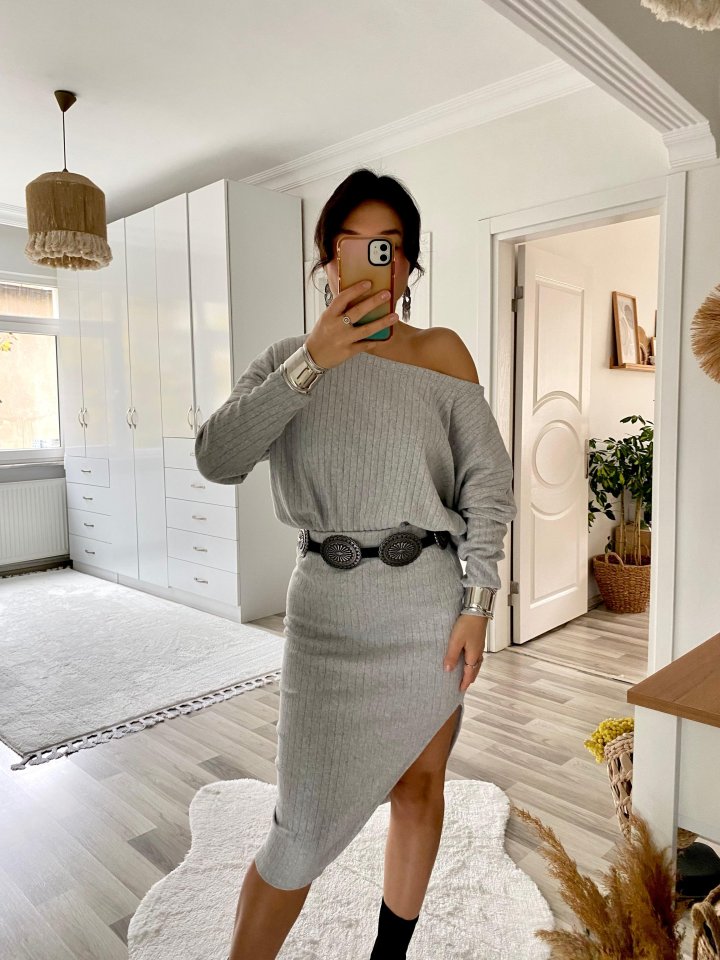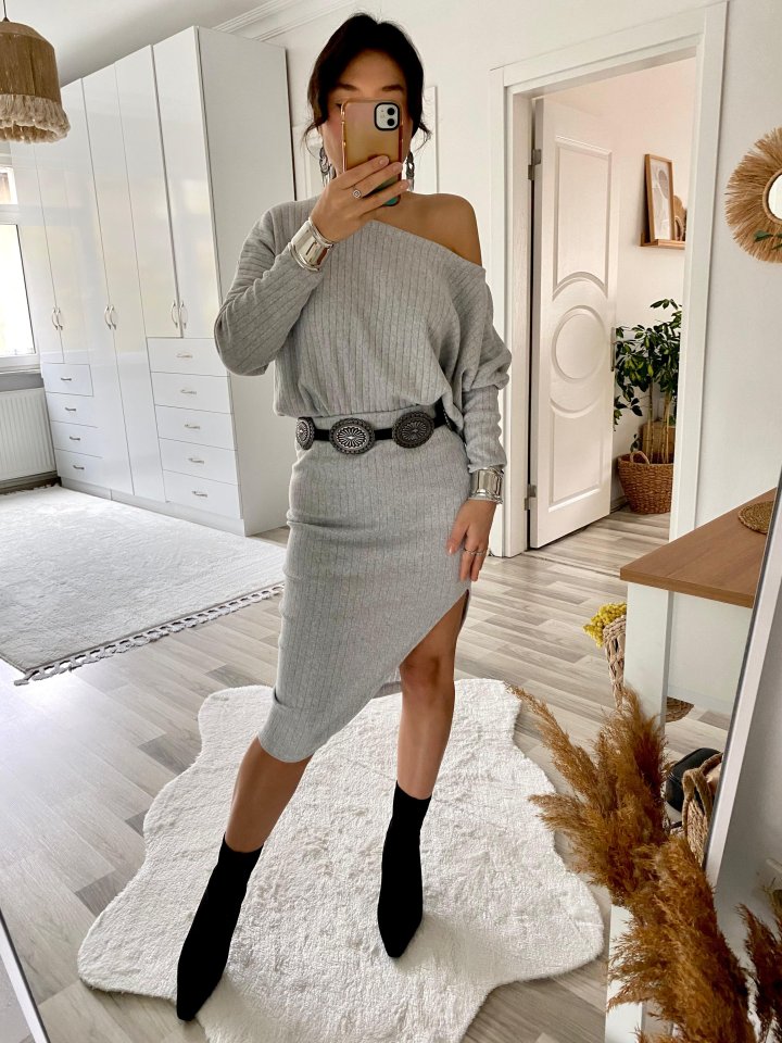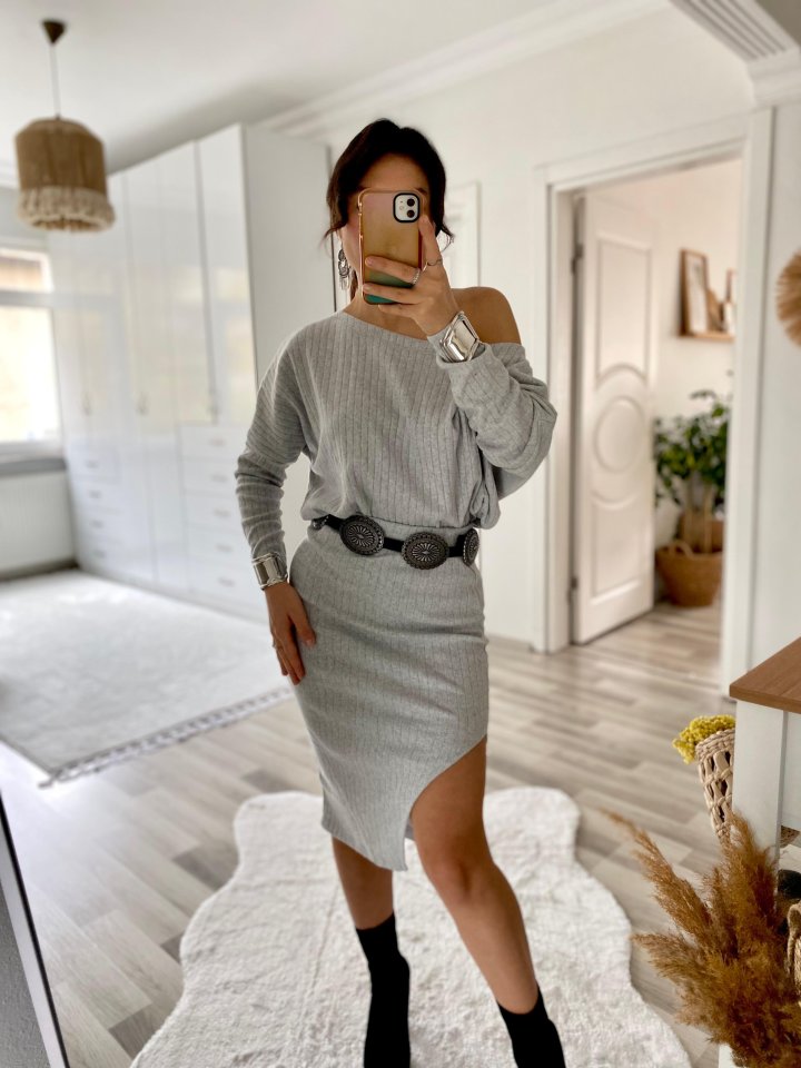 Kadın Uzun Kollu Düşük Omuz Yırtmaç Detay Kaşkorse Etek Bluz Ikili Takım