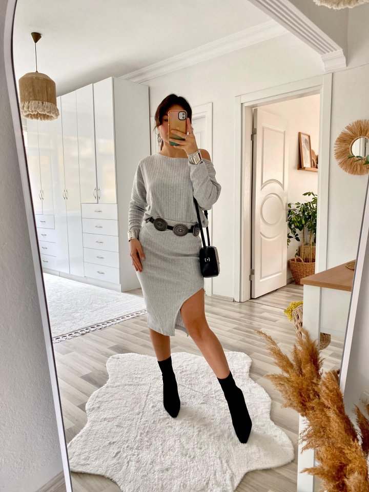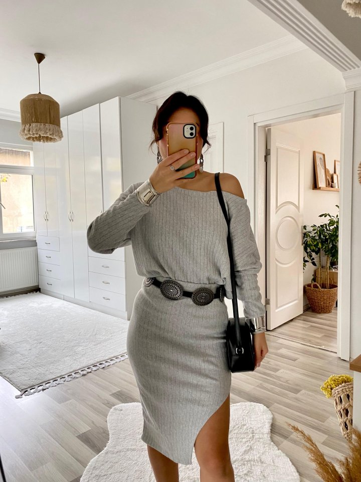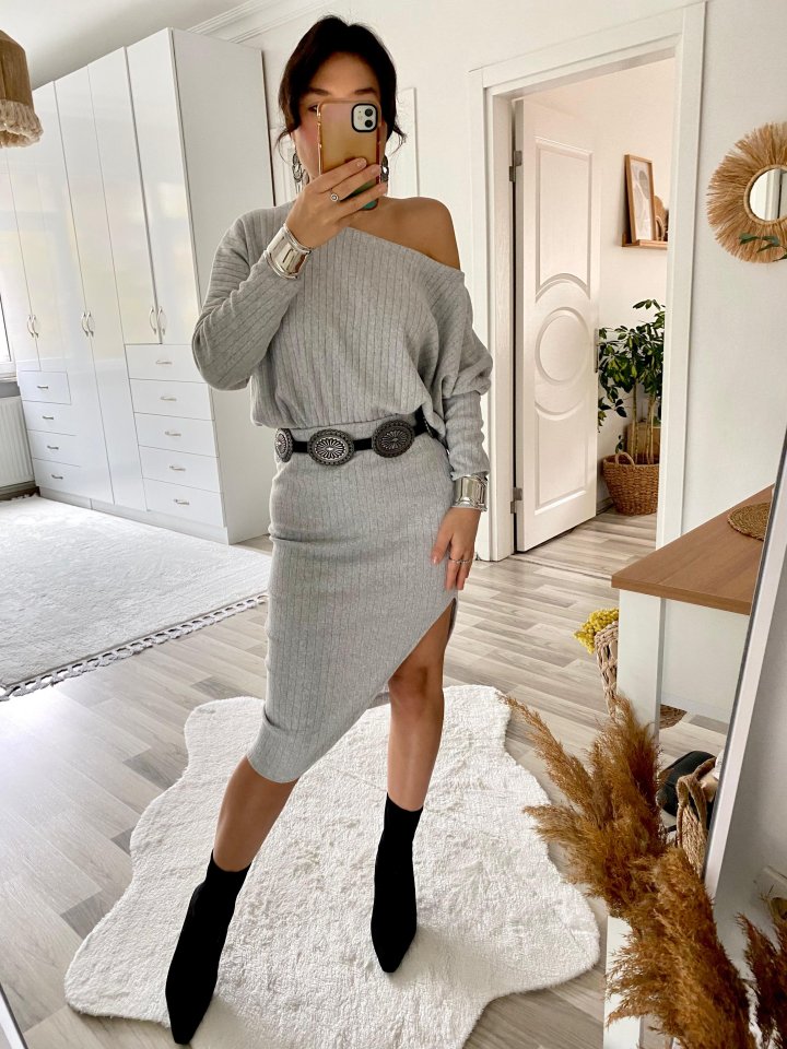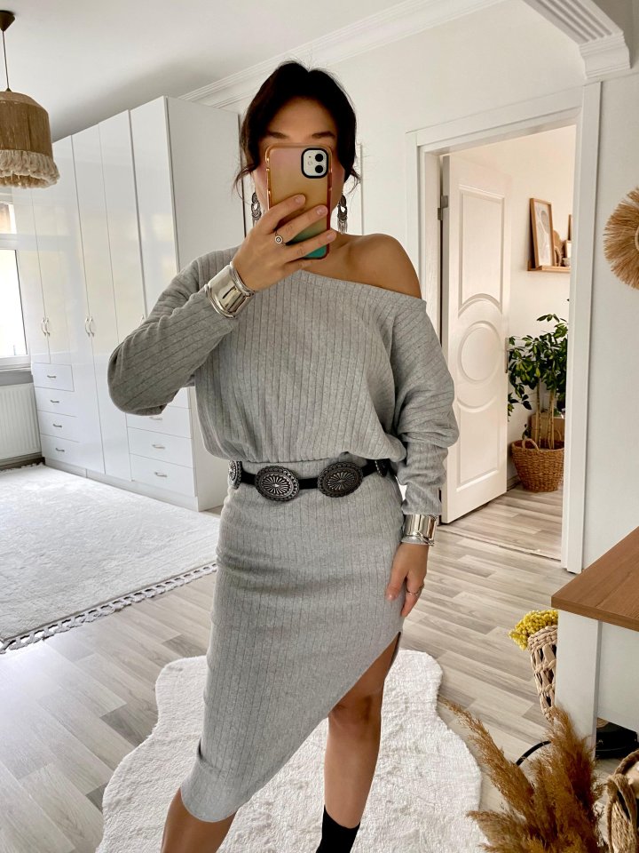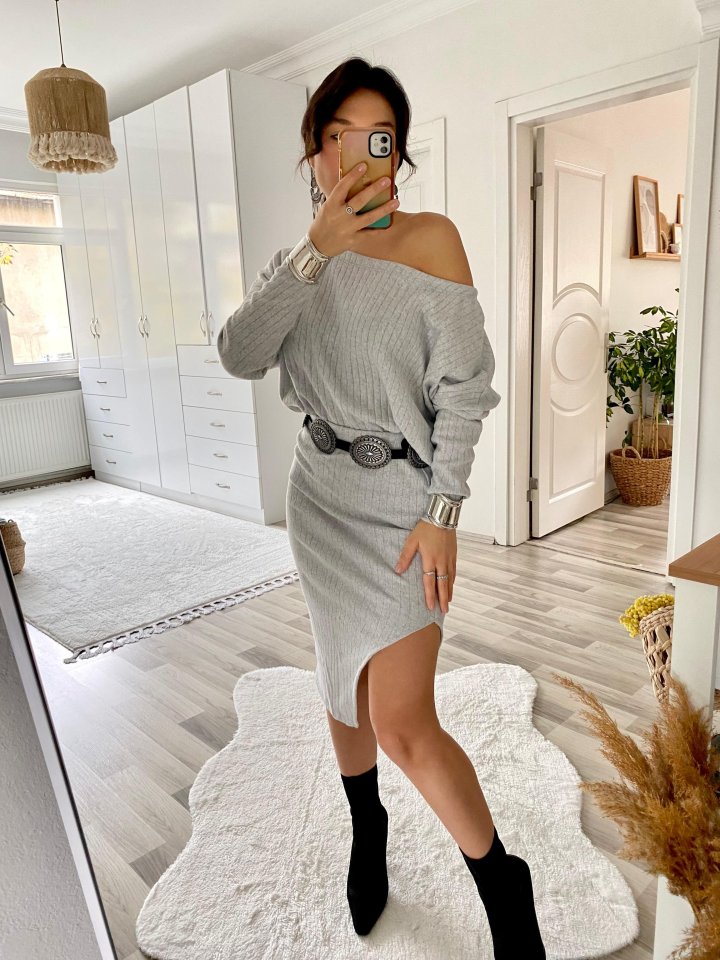 Kadın Uzun Kollu Düşük Omuz Yırtmaç Detay Kaşkorse Etek Bluz Ikili Takım