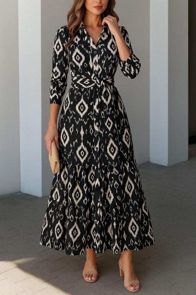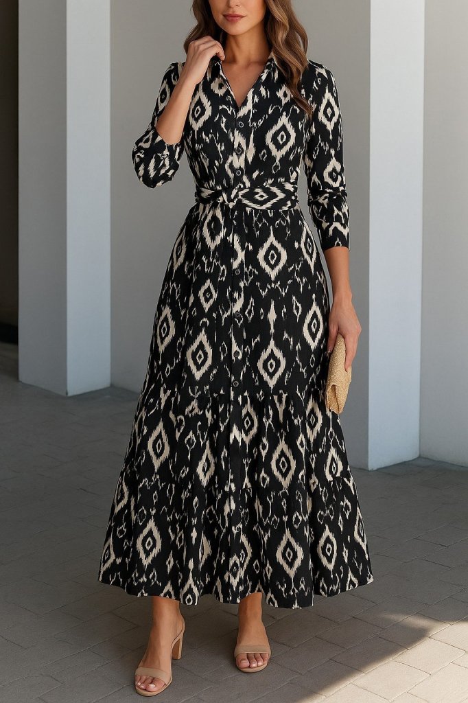 Kadın Uzun Kollu Eteği Fırfırlı Beli Kuşaklı Trikoton Tam Boy Gömlek Elbise
