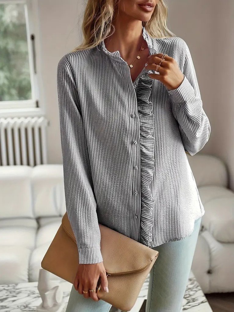 Kadın Uzun Kollu Fırfır Yakalı önden Düğmeli çizgili Burgu Gömlek