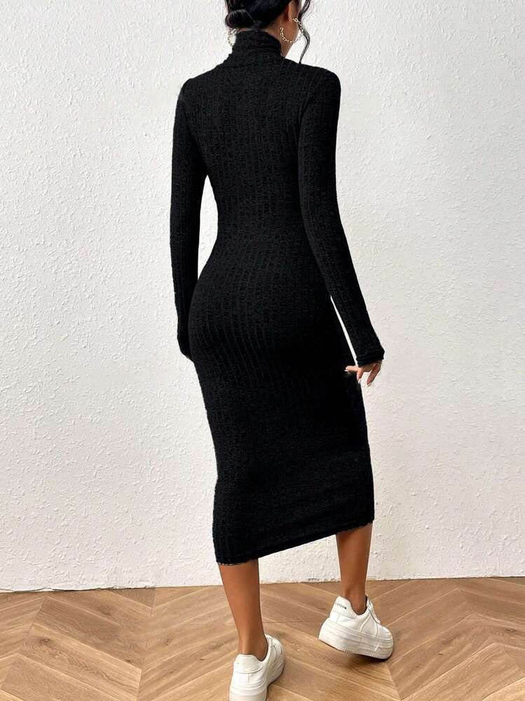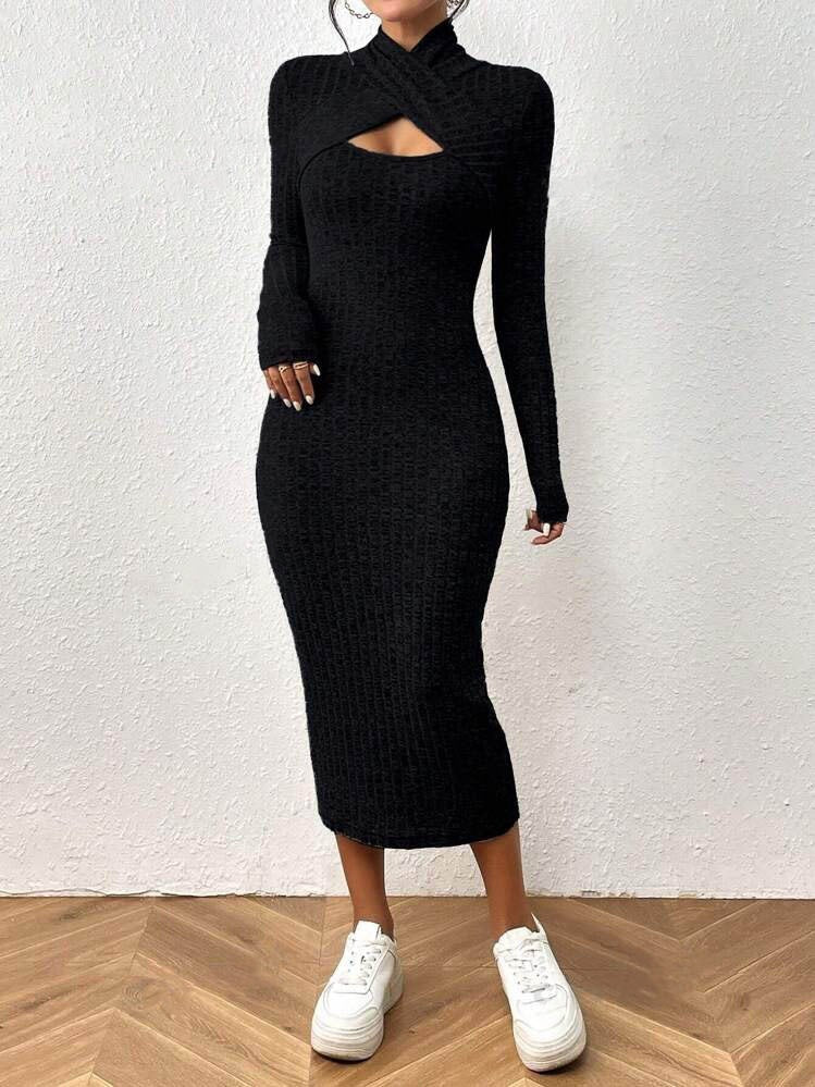 Kadın Uzun Kollu Göğüs Pencere Detaylı çapraz Yaka Detaylı şardonlu Kaşkorse Midi Elbise